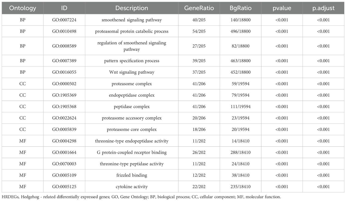 We focused on the differentially expressed genes associated with the Hedgehog signaling pathway (HRDEGs), identifying a total of 207 HRDEGs for functional enrichment analysis. Our key findings highlight the Wnt and Notch signaling pathways, which may play significant roles in the progression of breast cancer and in the development of treatment resistance. This aligns with existing literature emphasizing the importance of these pathways as potential therapeutic targets (37–39).