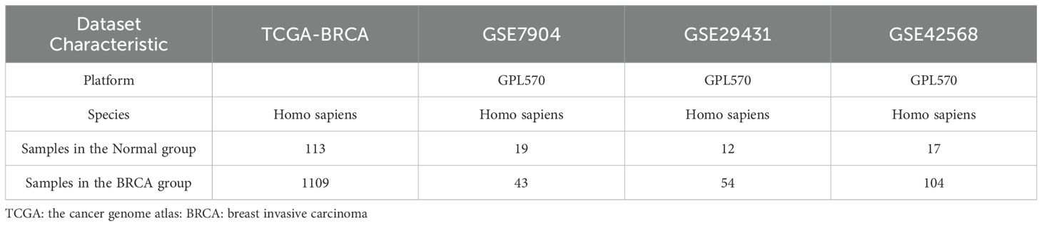 We performed Gene Set Enrichment Analysis (GSEA) using the clusterProfiler software, prioritizing genes based on log fold change (logFC) and identifying enriched gene sets from the MSigDB database using the “c2.cp.v7.2.symbols.gmt” set. Significant enrichment was defined by a p-value < 0.05 and false discovery rate (FDR) < 0.25, which strikes a balance between biological discovery and error control (23). Additionally, we applied Gene Set Variation Analysis (GSVA), an unsupervised method independent of parameter settings. GSVA was conducted using the “h.all.v7.4.symbols.gmt” gene set from MSigDB on the TCGA-BRCA dataset. This allowed us to assess variations in functional enrichment between normal and BRCA patient samples (24).