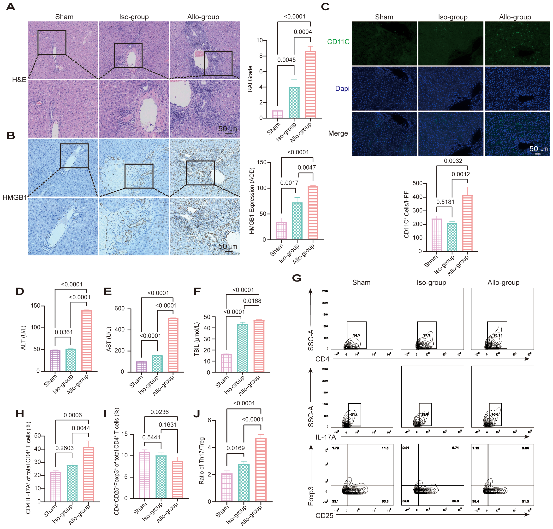 HMGB1 upregulation and Th17/Treg imbalance are associated with acute rejection in a rat liver transplantation (LT) model. (A) Representative hematoxylin and eosin (H&E)-stained sections of liver grafts from the sham, iso-group, and allo-group on postoperative day 7. The allo-group exhibits severe lymphocytic infiltration, bile duct injury, and endothelial inflammation. Scale bars: 50 μm. Rejection Activity Index (RAI) scores, evaluated according to Banff criteria, are significantly higher in the allo-group compared to the iso-group (p = 0.0004) and sham (p < 0.0001). (B) Representative immunohistochemical (IHC) staining for HMGB1 shows marked upregulation in the allo-group relative to the iso-group and sham group. Scale bars: 50 μm. Quantitative analysis of HMGB1 expression by average optical density (AOD) reveals significantly elevated levels in the allo-group versus the iso-group (p = 0.0047) and sham group (p < 0.0001). (C) Representative immunofluorescence (IF) images showing CD11c (green) and DAPI (blue) staining in liver sections from the sham, iso, and allo-group. Scale bar = 50 μm. Quantitative analysis of CD11c+ cells per high-power field (20× objective) demonstrated a significant increase in the allo-group compared with the sham group (p = 0.0032) and iso-group (p = 0.0012). (D-F) Serum alanine aminotransferase (ALT), aspartate aminotransferase (AST) levels, and total bilirubin (TBIL) were significantly elevated in the allo-group compared with the sham and iso-group (p < 0.05 for all comparisons). (G-J) Representative flow cytometry (FCM) plots and quantification of CD4+ T cells, Th17 cells (CD4+IL-17A+), and Treg cells (CD4+CD25+Foxp3+) from the sham, iso-group, and allo-group. The proportion of Th17 cells was significantly increased in the allo-group compared with both the iso-group (p = 0.0044) and sham (p = 0.0006). Treg frequencies were significantly reduced in the allo-group compared with the sham group (p = 0.0236), while no significant difference was observed between the allo-group and iso-group (p = 0.1631). As a result, the Th17/Treg ratio was markedly elevated in the allo-group relative to both the sham (p < 0.0001) and iso-group (p < 0.0001). Data are expressed as mean ± SD; statistical significance was determined by one-way ANOVA (p < 0.05).