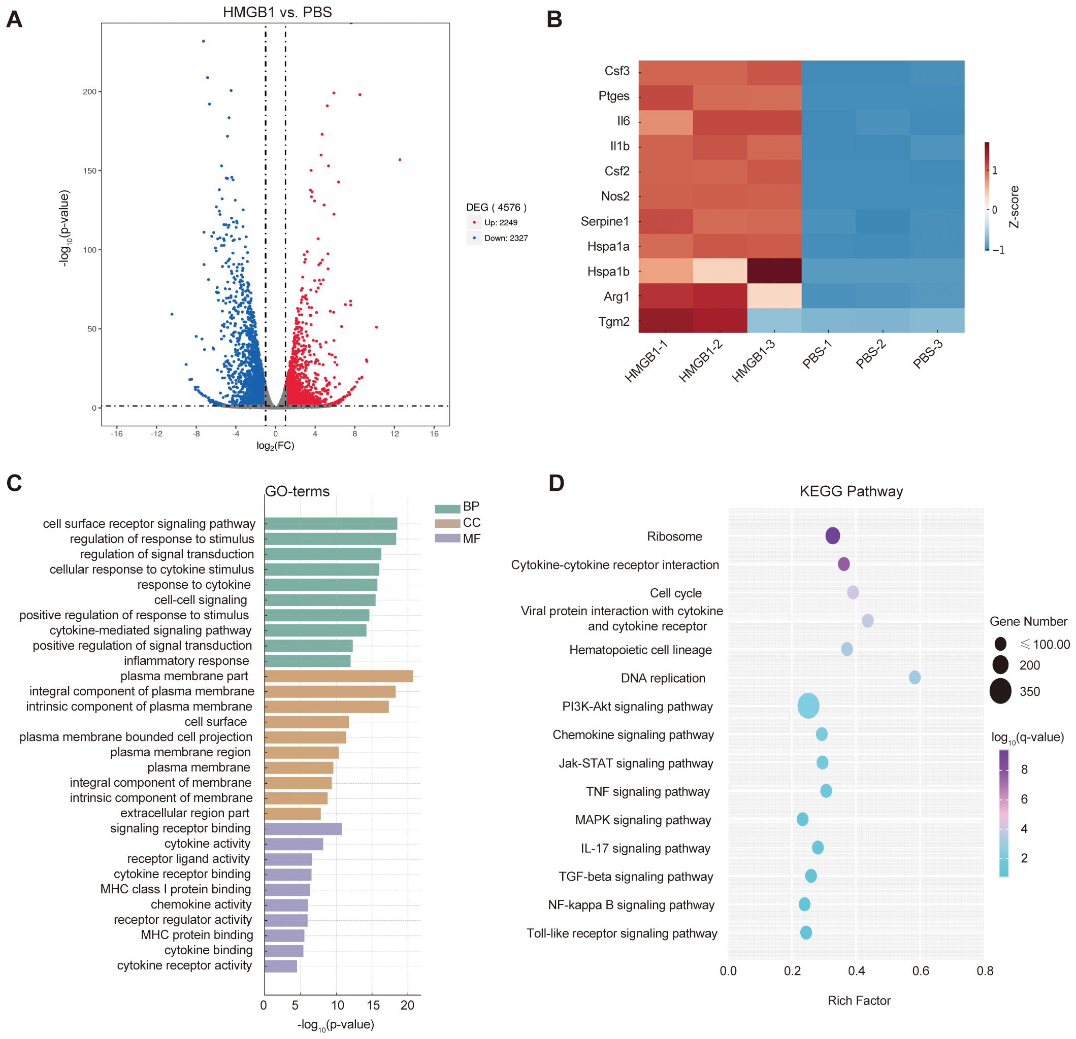 HMGB1-induced transcriptomic alterations in dendritic cells (DCs). (A) Volcano plot showing differentially expressed genes (DEGs) in HMGB1-treated DCs vs. PBS controls (|log2FC| > 1.0, q < 0.05), with 2,249 upregulated (red) and 2,327 downregulated (blue) genes. (B) Heatmap illustrating relative expression levels of selected immune-related genes involved in proinflammatory mediators (e.g., Nos2, Il6, Il1b), DC activation and cytokine signaling (e.g., Csf2, Csf3, Ptges), and stress response factors (e.g., Hspa1a, Serpine1). Color intensity indicates log2-scaled expression values. (C) Gene Ontology (GO) enrichment analysis identifying significantly enriched biological processes (BP), cellular components (CC), and molecular functions (MF) (p-value < 0.05). Enriched GO terms include immune regulation (e.g., inflammatory response, cytokine-mediated signaling pathway), plasma membrane region, extracellular region part, and molecular functions such as cytokine receptor binding and receptor-ligand activity. (D) KEGG pathway enrichment analysis of HMGB1-treated DCs. Immune-related pathways with strong mechanistic relevance—such as cytokine–cytokine receptor interaction, NF-κB signaling, Jak–STAT signaling, and IL-17 signaling—were highlighted. Dot size represents gene counts; color gradient indicates –log10(q-value).