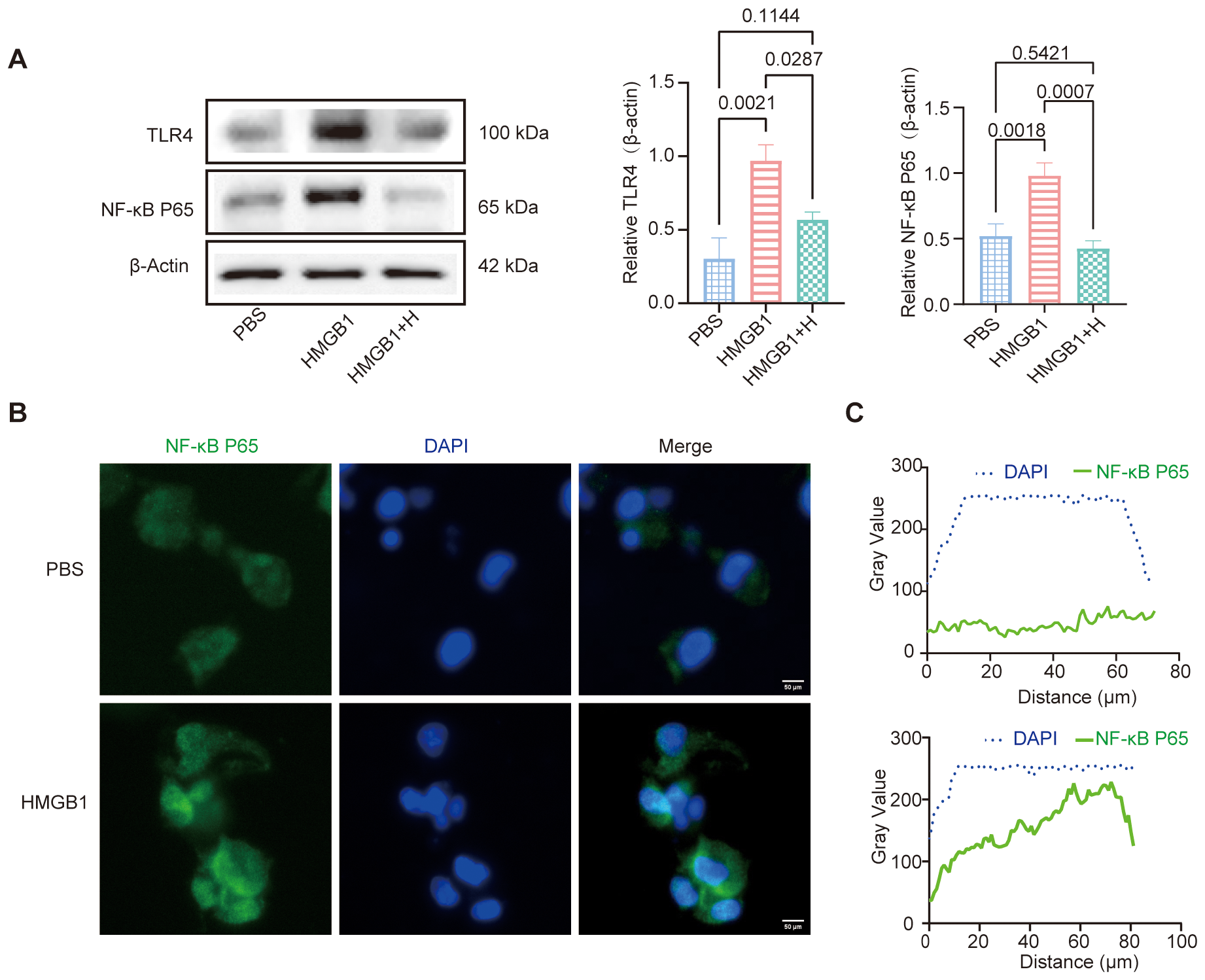 HMGB1-NF-κB axes promote DCs activation. (A) Western blot (WB) analysis of TLR4 and NF-κB p65 expression, with β-Actin as an internal control. Quantification of TLR4 and NF-κB p65 expression using AOD analysis. AOD revealed that HMGB1 significantly increased TLR4 (p = 0.0021) and NF-κB p65 (p = 0.0018) expression compared with PBS. Helenalin treatment markedly reduced NF-κB p65 expression (p = 0.0007) and moderately decreased TLR4 levels (p = 0.0287), though not statistically different from PBS. (B) IF analysis demonstrated that HMGB1 promoted NF-κB p65 nuclear translocation, as evidenced by co-localization with DAPI. Scale bars: 50 μm. (C) Gray value analysis confirmed an increase in nuclear NF-κB p65 signal (green). Data are presented as mean ± SD and analyzed by one-way ANOVA (p < 0.05).
