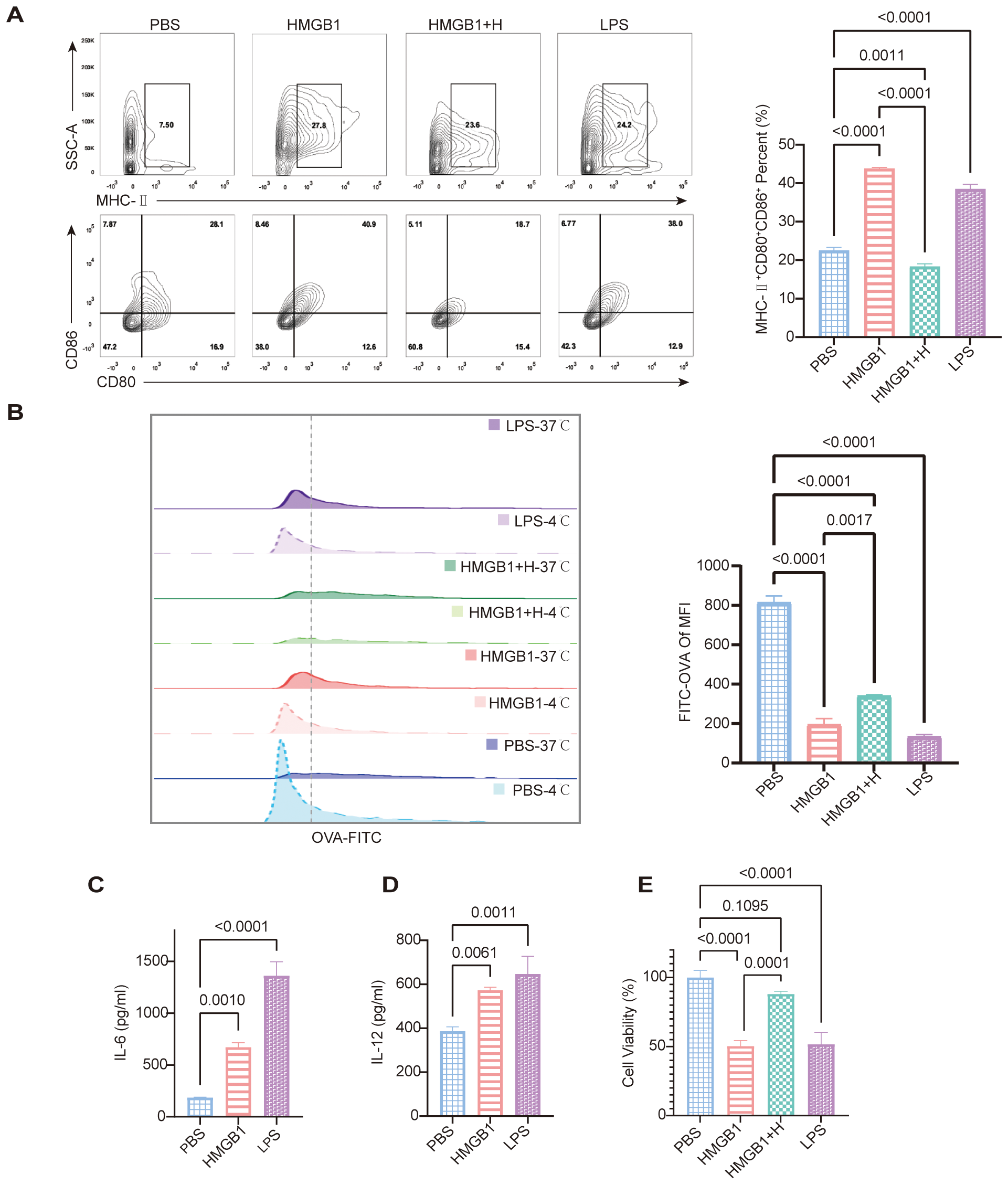 HMGB1 promotes DC maturation and impairs phagocytic function, while NF-κB inhibition reverses these effects. (A) FCM analysis shows increased expression of maturation markers (MHC-II, CD80, CD86) in HMGB1-treated DCs, which is reduced by helenalin. Quantification of MHC-II+CD80+CD86+ confirms a significant increase in the HMGB1 group vs. PBS, partially reversed by helenalin (p < 0.0001). LPS also significantly increases mature DCs (p < 0.0001). (B) OVA-FITC uptake assay shows reduced antigen uptake in HMGB1-treated DCs, partially restored by helenalin. FITC-OVA mean fluorescence intensity (MFI) confirms HMGB1-induced antigen uptake reduction (p < 0.0001), reversed by helenalin (p = 0.0017). (C, D) ELISA shows HMGB1 significantly increases IL-6 (p = 0.0010) and IL-12 (p = 0.0061); LPS-treated DCs exhibit the highest cytokine levels (p < 0.0001, p = 0.0011). (E) Cell viability of BMDCs was assessed using the CCK-8 assay. Both HMGB1 and LPS significantly reduced cell viability compared with PBS controls (p < 0.0001), while helenalin partially reversed the HMGB1-induced decrease in viability (p = 0.0001). Data are presented as mean ± SD and analyzed by one-way ANOVA (p < 0.05).