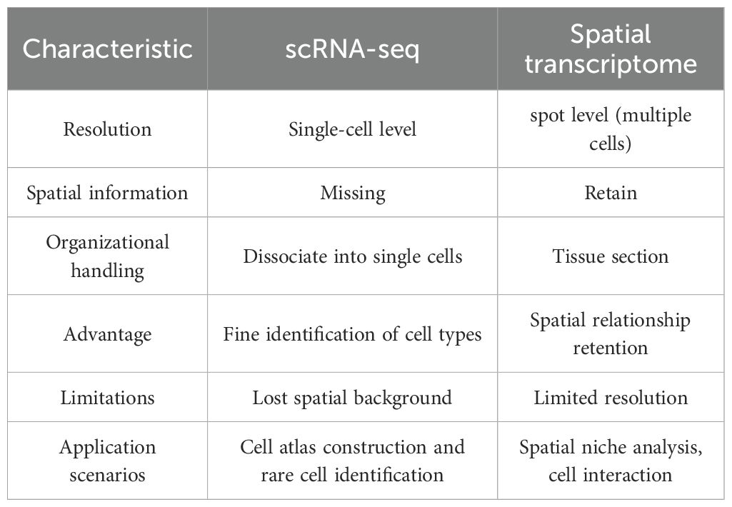 Despite these strengths, scRNA-seq also exhibits notable limitations. RNA capture efficiency per cell is relatively low (52). The method remains costly and technically challenging, necessitating careful optimization of sample processing protocols (53, 54). Critically, the mandatory tissue dissociation disrupts native spatial relationships, hindering analysis of cell–cell interactions within intact tissue architectures (55, 56). The comparison of scRNA-seq and ST is shown in Table 1.