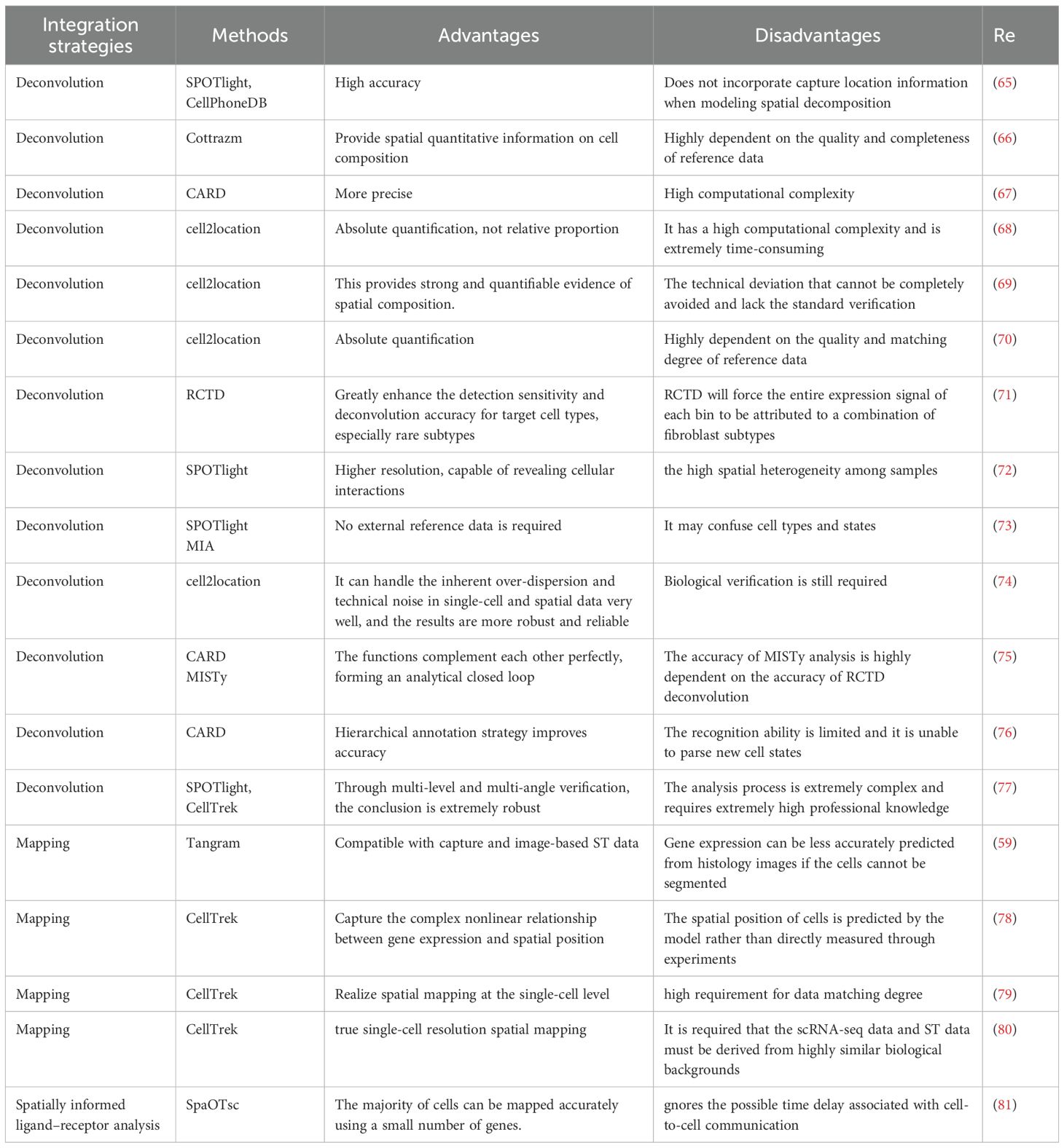 Combining scRNA-seq and ST provides deeper insights into cellular interactions with their microenvironment (61–63), with critical implications for both diagnostics and therapeutics. This integrative strategy supports the identification of spatially informed biomarkers and therapeutic targets by linking gene expression patterns to precise tissue regions, thereby advancing personalized medicine and enhancing disease diagnosis (64). Currently, two major computational approaches are used to this integration: deconvolution and mapping. Deconvolution utilize single-cell reference datasets to computationally estimate the cellular composition within each spatial capture spot, determining proportions of various cell types. Mapping approaches assign scRNA-seq-defined cellular subtypes to cells within spatial maps or localize individual scRNA-seq profiles to specific tissue niches. The characteristics of different integration strategies are shown in Table 2. These analyses provide critical spatial context to inferred ligand–receptor interactions and other forms of intercellular communication derived from scRNA-seq data.