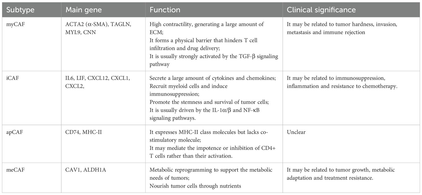 CAFs are a major stromal component in the TME, critically contributing to tumor initiation, progression, invasion, metastasis, and therapeutic resistance. CAFs typically originate from resident fibroblasts or precursor cells activated by tumor-derived signals. They exhibit high heterogeneity and secrete diverse cytokines, growth factors, and ECM components, collectively remodeling the TME to facilitate tumor development. CAFs significantly modulate tumor behavior (123–125). Their functional plasticity and diversity not only promote tumor progression but also represent potential therapeutic targets. SeRNA-seq has revealed substantial CAFs heterogeneity, identifying multiple transcriptionally distinct CAF subtypes within the TME (Table 3) (126–128).