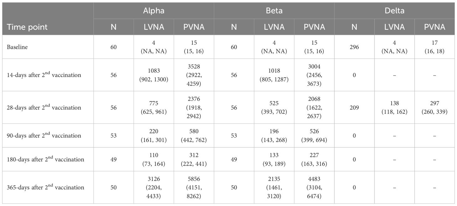 Descriptive analysis was performed on all the sera, categorized by the sampling visit times, assay methods, and corresponding variants. The Geometric mean titers (GMTs) and their 95% confidence intervals were calculated for each category (Table 1). At some time points, neutralizing antibodies against the Delta variant were not measured because the variant emerged later. It can be seen that at baseline, almost all the antibody titers were below the LLOQ. At 14 days after the second vaccination, the antibody titers increased significantly compared to baseline, followed by a gradual decrease over time. However, the neutralizing antibodies increased significantly again on 365 days after vaccination. The possible reasons might include known or unknown SARS-CoV-2 infection and close contact with COVID-19 individuals during the SARS-CoV-2 epidemic due to the decline of neutralizing antibodies and the emergence of new variants.