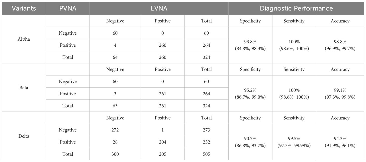 Results: We analyzed 324 samples for Alpha and Beta variants and 505 for Delta. Compared with LVNA, the sensitivity and specificity of PVNA were over 90% across all variants, with accuracy rates of 98.8% for Alpha, 99.1% for Beta, and 94.3% for Delta. The Pearson correlation between PVNA and LVNA was strong for Alpha (CORR = 0.9614), Beta (CORR = 0.9517), and Delta (CORR = 0.9072). Bland-Altman plots and Kernel density plots indicated good agreement between PVNA and LVNA.