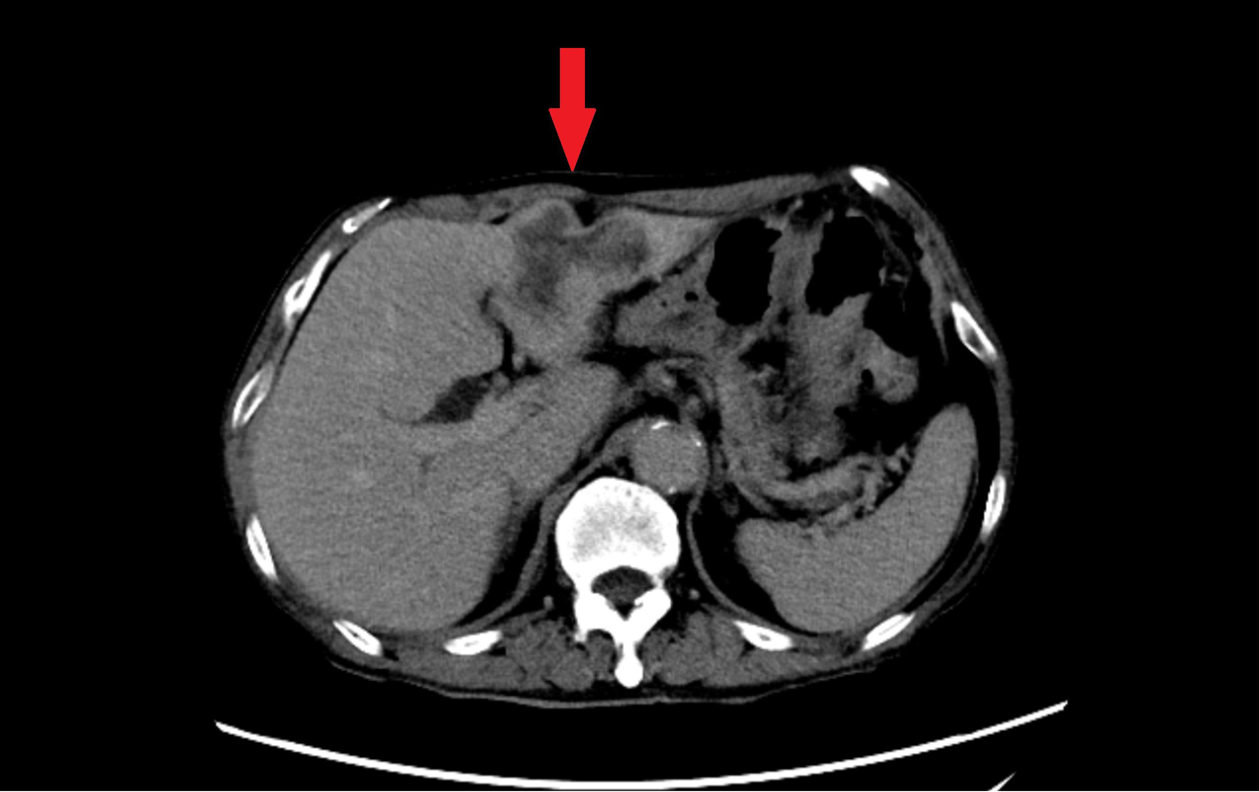 Figure 2. Abdominal contrast-enhanced CT in the equilibrium phase. Axial imaging demonstrates an irregular, heterogeneously enhancing mass in the left hepatic lobe (red arrow), accompanied by adjacent bile duct dilatation.