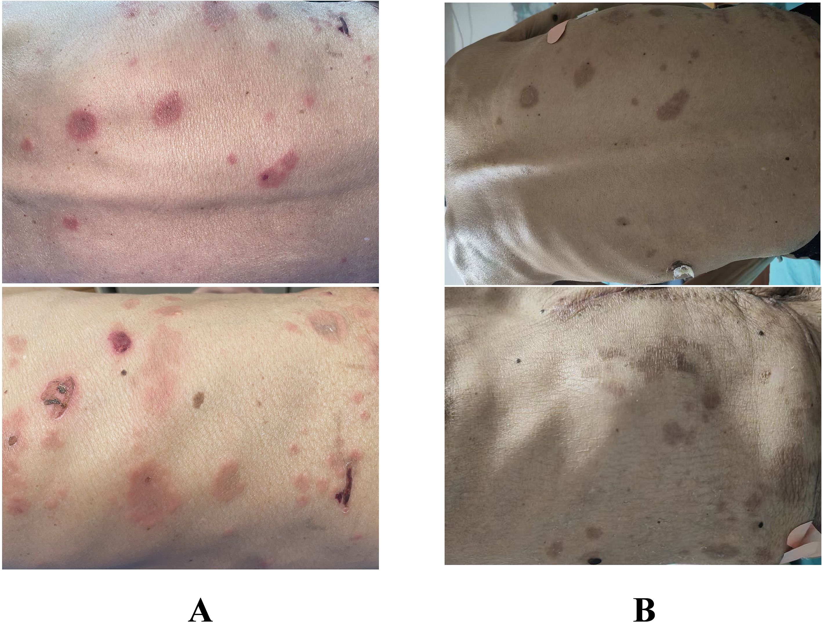 Figure 3. Presentation of the patient’s lesions. (A) Pre-treatment lesions. (B) Post-treatment lesions.