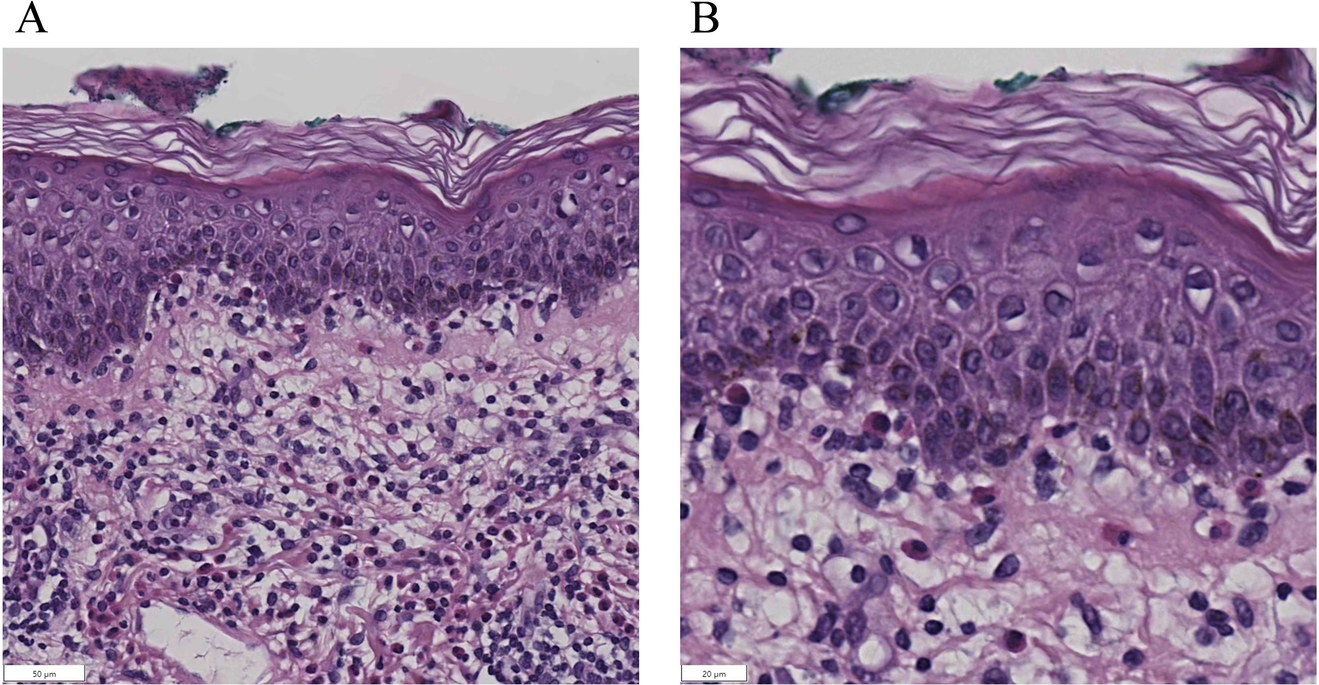 Figure 4. Histopathological examination of skin biopsy (hematoxylin-eosin staining). Subepidermal blister formation is observed, with lymphocytes and eosinophils within the blister cavity. The dermoepidermal junction exhibits edema and a mixed inflammatory infiltrate composed of lymphocytes and eosinophils. (A). Low-magnification view (×200). (B). High-magnification view (×400).