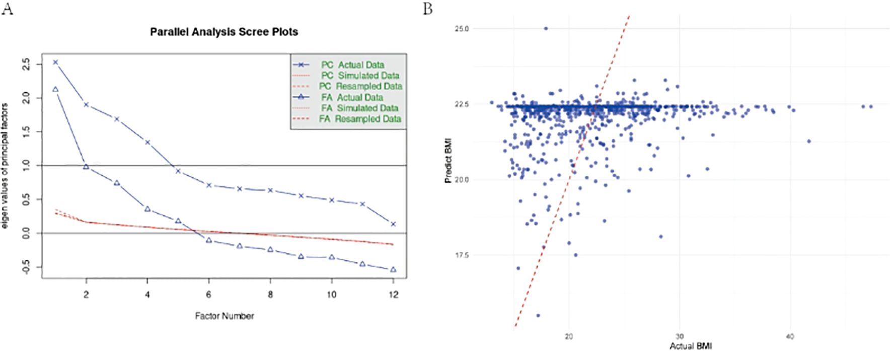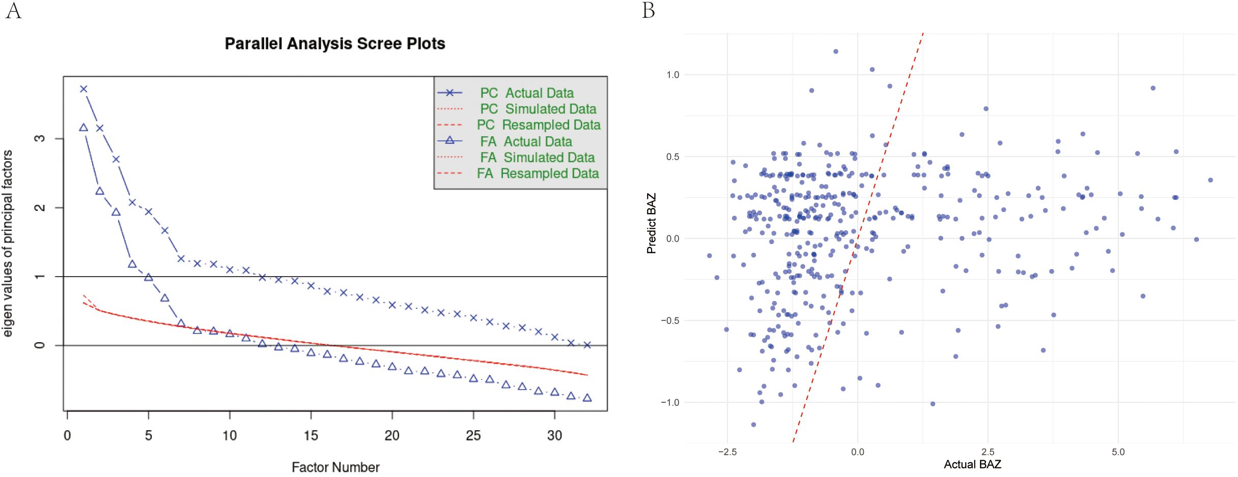Figure 1. (A) Parallel analysis scree plot for all valid indicators. This plot compares eigenvalues from actual data (solid line, dots) with mean eigenvalues generated from random data (dashed line, crosses) to determine the number of factors. The red line represents the eigenvalue threshold of 1 (Kaiser criterion). (B) Comparison of predicted vs. actual BAZ values using multivariate GLM model in children group. Scatter plot showing the relationship between model-predicted BAZ values and actual BAZ values, with a red dashed line indicating perfect prediction.