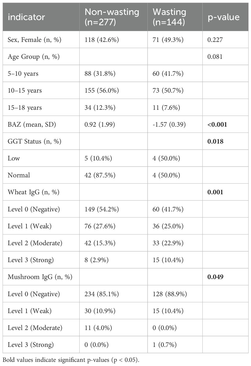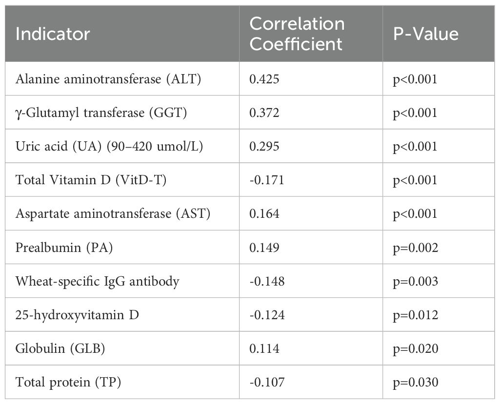 Food-specific IgG antibodies for milk, egg, wheat, rice, corn, soybean, tomato, cod, crab, mushroom, shrimp, beef, pork, and chicken were all determined using enzyme-linked immunosorbent assay (ELISA) kits (manufacturer details withheld for anonymization) following the standardized protocol described by Patil et al. (18). Serum samples underwent a four-step process: 1) antigen-coated plate incubation (2 hours, 37°C), 2) blocking with 5% bovine serum albumin (30 minutes, room temperature), 3) serum sample incubation (1:100 dilution, 1 hour, 37°C), and 4) horseradish peroxidase-conjugated secondary antibody detection (45 minutes, 37°C). Optical density values were measured at 450 nm using a microplate reader, with results expressed as kilounits per liter (kU/L). Positive thresholds followed manufacturer-defined cutoffs (>12 kU/L for all antigens). Except, the following indicators were systematically assessed in this study. Basic demographic information, including age group and gender, was collected through standardized questionnaires. BMI was calculated from objectively measured height and weight. Liver function parameters, including alanine aminotransferase (ALT), aspartate aminotransferase (AST), gamma-glutamyl transferase (GGT), total bilirubin (TB), direct bilirubin (DB), and indirect bilirubin (IB), were analyzed using an automated biochemical analyzer. Renal function was assessed by measuring urea, creatinine (CREA), and uric acid (UA) with the same automated biochemical analyzer, while cystatin C (CysC) was determined by immunoturbidimetric assay. The glomerular filtration rate (GFR) was estimated based on CREA levels. Protein nutritional status indicators, including total protein (TP), albumin (ALB), globulin (GLB), and prealbumin (PA), were measured using an automated biochemical analyzer, with PA quantified via immunoturbidimetry. Vitamin status was evaluated by measuring 25-hydroxyvitamin D using a chemiluminescence immunoassay, and vitamins K1 and K2 were assessed using enzyme-linked immunosorbent assay (ELISA).