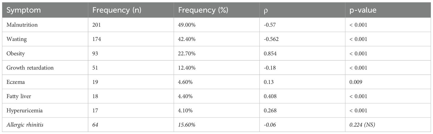 Table 2. Correlation analysis between symptoms and BAZ scores in pediatric population (significant results only).