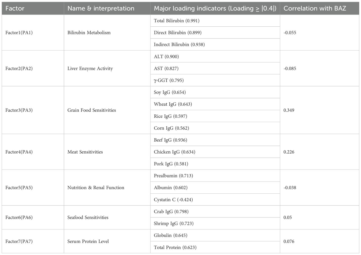 Exploratory Factor Analysis was performed to explore the underlying structure among the indicators significantly correlated with the core indicator (BAZ). Additionally, we conducted factor analysis on all valid indicators to explore broader underlying structures. Seven factors explained 42.4% of total variance (Figure 1A). Factor 3 (food sensitivity: wheat IgG loading = 0.643, soy = 0.654) showed the strongest BAZ correlation (r = 0.349). The hepatic enzyme factor (ALT = 0.900, AST = 0.827) correlated moderately with BAZ (r = 0.372–0.425), while the bilirubin metabolism factor (total bilirubin = 0.991, direct = 0.899) showed no significant association (Table 4). Noting the prominent role of food sensitivity in BAZ variation, we performed targeted analysis of antigen-specific IgG associations.