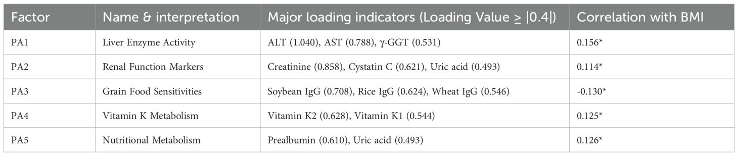The underweight group skewed younger (63.3% aged 18–30 vs. 31.6% controls, p < 0.001) with lower mean BMI (16.53 ± 1.15 vs. 24.12 ± 4.46, p < 0.001). Hepatic profiling revealed elevated bilirubin abnormalities in the underweight group (total bilirubin: 10% vs. 0%, p = 0.007; direct bilirubin: 40% vs. 6.2%, p = 0.003) alongside globulin dysregulation (10% vs. 0%, p = 0.018) (Supplementary Table 2). To identify systemic drivers of these clinical patterns, we performed factor analysis on adult metabolic profiles.