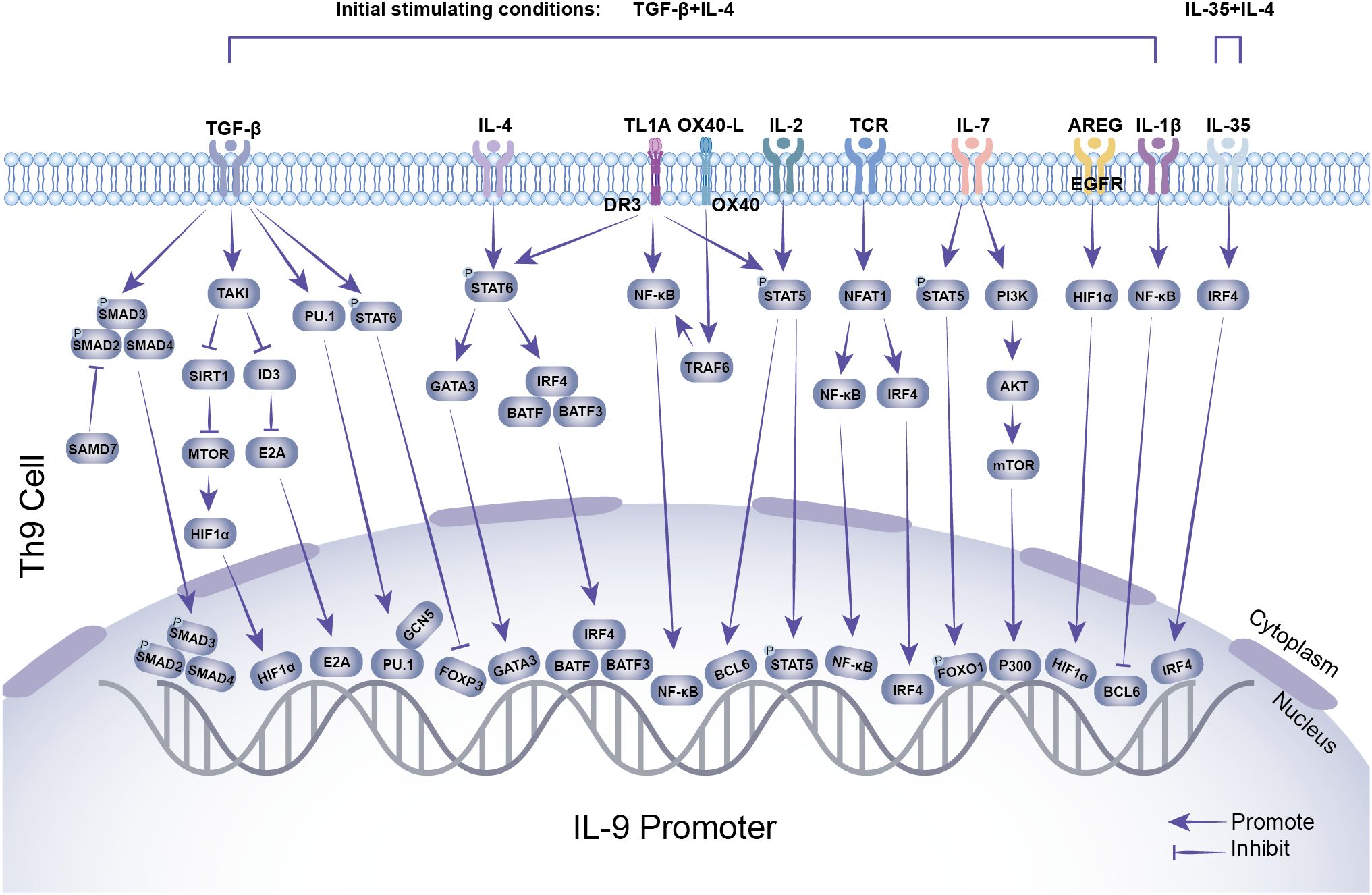 Th9 cell differentiation is precisely regulated by a range of exogenous signals, with TGF-β and IL-4 acting as the primary initiation signals. TGF-β and IL-4 work together with T cell receptors (TCRs), IL-2, and Toll-like receptors (TLRs) to drive Th9 differentiation. In addition, several regulatory pathways have been shown to operate independently of TGF-β and IL-4, highlighting the complexity and diversity of the Th9 differentiation network.