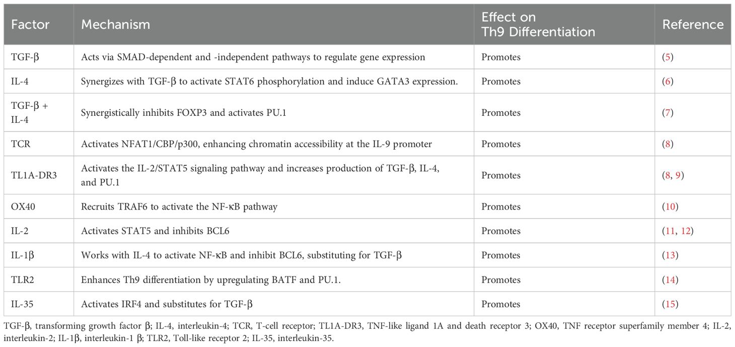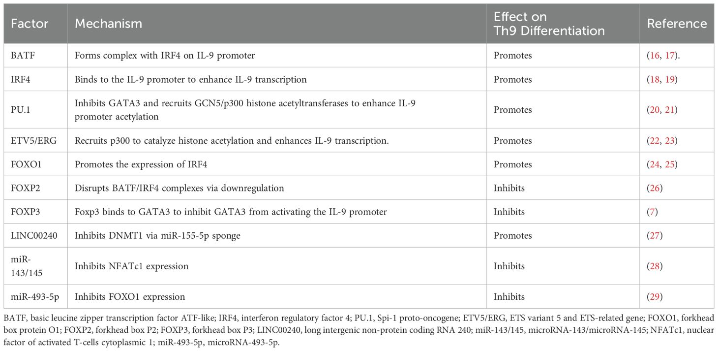 As shown in Figure 1 and Tables 1–3, Th9 cell differentiation is regulated by multiple factors. The process initiates with fundamental T cell receptor (TCR) recognition of antigen and co-stimulatory signals. These signals are mediated by molecules and pathways, such as NFAT1/CBP/P300 and NF-κB, which establish the foundation for subsequent lineage commitment. The synergistic action of the exogenous cytokines TGF-β and IL-4 then serves as the key signal that initiates the differentiation of naïve CD4+ T cells into the Th9 lineage (7, 38). TGF-β and IL-4 promote Th9 differentiation by suppressing FOXP3 expression and activating the STAT6/GATA3 axis in activated naïve CD4+ T cells. Endogenous transcription factor BATF is a key transcription factor in the early development of Th9 cells, which promotes Th9 cell differentiation by forming a complex with IRF4 (16). As a downstream transcription factor of TGF-β signaling, PU.1 is a core regulatory factor for both the differentiation and functional exertion of Th9 cells. PU.1 binds to the IL-9 promoter, regulates chromatin accessibility to enhance IL-9 transcription, thereby promoting the directional differentiation of Th9 cells (20). Epigenetic regulation, including histone acetylation and DNA methylation, finely regulates the expression of the key cytokine IL-9 and the core transcription factor PU.1 in Th9 cells by altering chromatin accessibility and gene expression levels. Hypoxia-inducible factor-1α (HIF-1α) is a key molecule linking metabolism and transcriptional regulation. HIF-1α supplies the necessary energy for Th9 cell differentiation by promoting metabolic pathways such as glycolysis (30). Moreover, it functions as a signaling molecule to regulate transcriptional programs. This reflects the close association between metabolism and Th9 cell differentiation. This review systematically summarizes the latest research progress in the field of Th9 cell subset differentiation, laying a theoretical foundation for elucidating the mechanisms of Th9 cell differentiation and developing novel immunotherapies for related diseases.