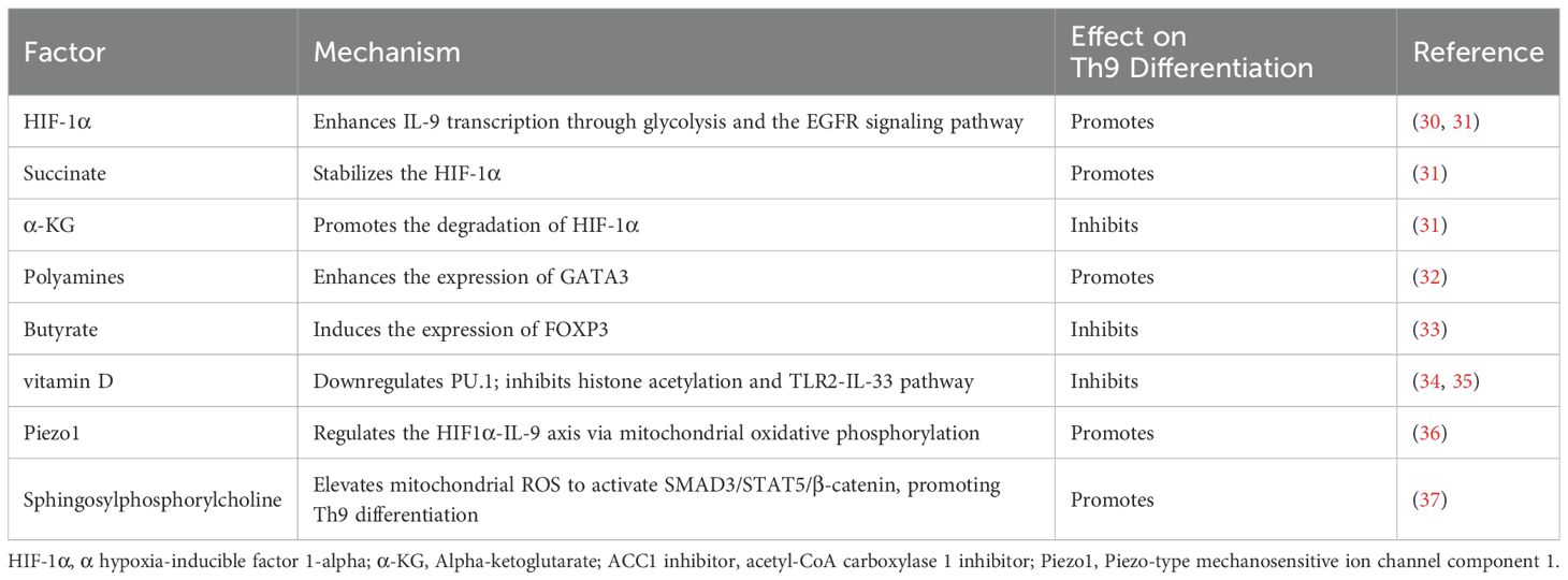 The metabolic microenvironment further regulates Th9 differentiation through metabolitic homeostasis. While succinate stabilizes HIF-1α through succinylation modifications to promote Th9 differentiation, α-ketoglutarate (α-KG) suppresses Th9 differentiation by promoting degradation of HIF-1α (31). Butyrate from gut bacteria and polyamines from the host have opposing effects. Butyrate reduces IL-9 synthesis by activating FOXP3 (33), whereas polyamines positively regulate IL-9 production by increasing GATA3 expression (32). The regulatory network of metabolites provides novel treatment targets for metabolically-based immunomodulatory methods by highlighting the critical role of microenvironmental metabolic homeostasis on Th9 differentiation.