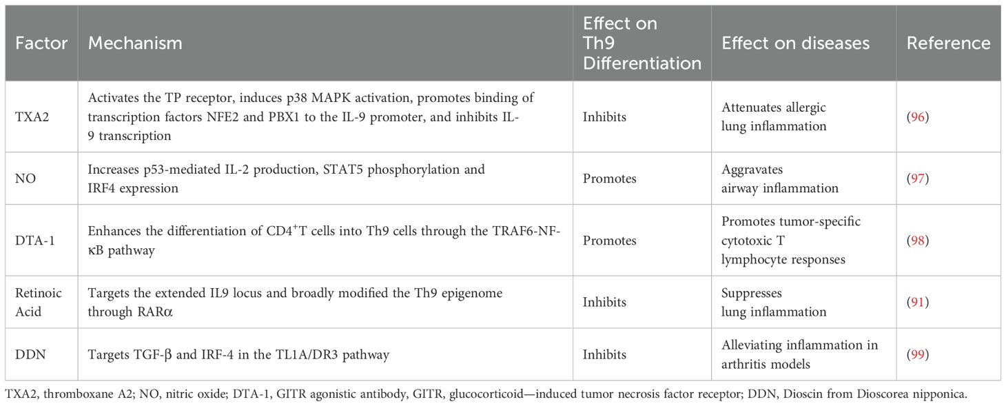 Th9 cells influence the progression of various diseases. PU.1-mediated IL-9 secretion by Th9 cells disrupts the intestinal barrier, contributing to disease exacerbation in ulcerative colitis (82). Adoptive transfer of Th9 cells significantly inhibits melanoma progression. This anti-tumor effect relies on IL-9-mediated tumor cytotoxicity and activation of CD8+ T cells (93, 94).In children with methicillin-resistant Staphylococcus aureus (MRSA) pneumonia, miR-155 promotes Th9 cell differentiation by silencing the deacetylase Sirtuin 1 (SIRT1), exacerbating pulmonary inflammation (95). Thus, Th9 cells have emerged as a potential therapeutic target for various diseases (Table 4). Studies have shown that Dioscin from Dioscorea nipponica Th9 cell differentiation by suppressing TGF-β and IRF4 in the tumor necrosis factor-like ligand 1A-death receptor 3 (TL1A-DR3) pathway, providing a new insight for the treatment of RA (99). These findings establish the therapeutic value of targeting Th9 cells and their associated signaling pathways, providing novel approaches for precision treatment of Th9-related diseases.