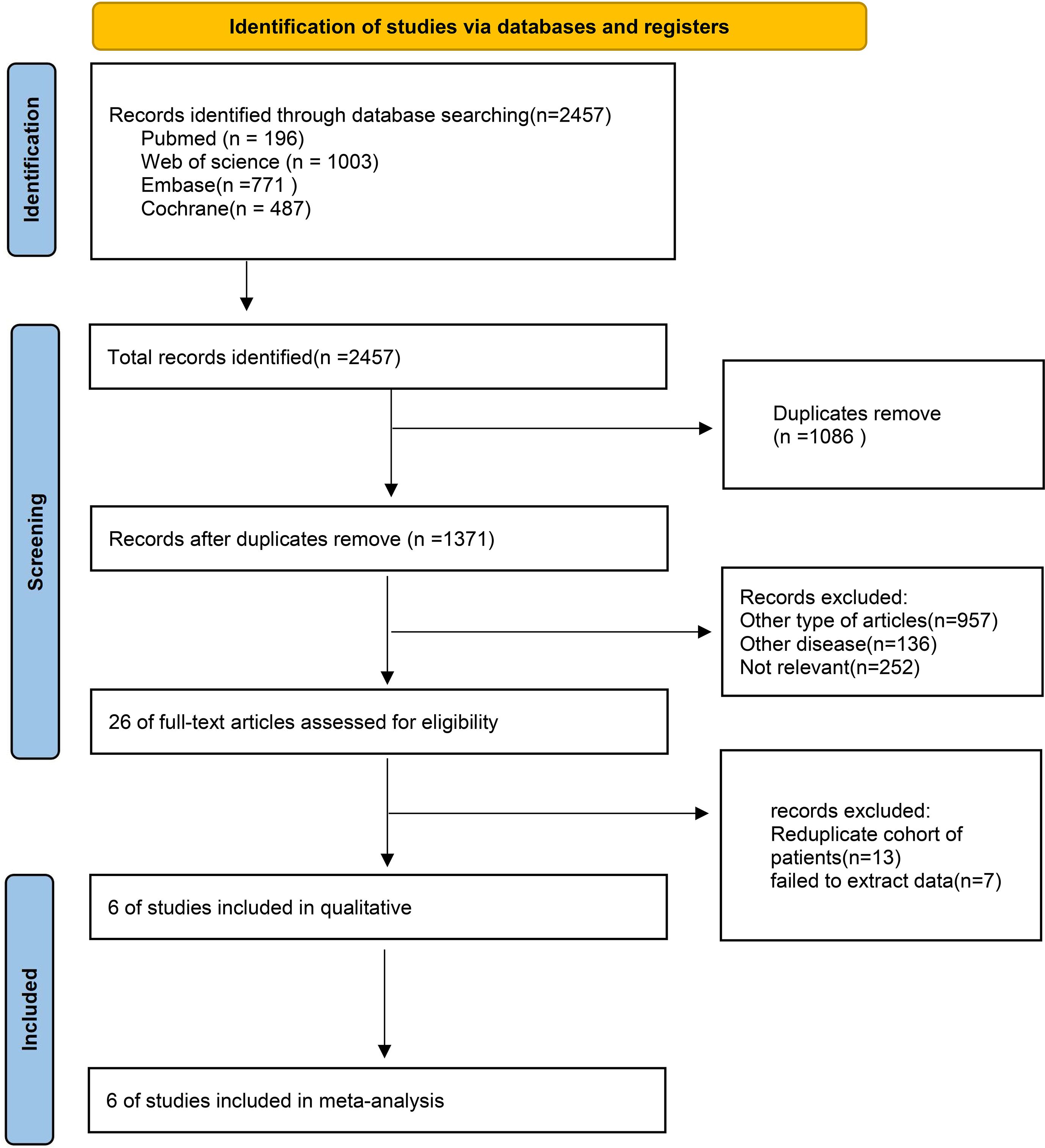 Flowchart illustrating study selection from databases. Identification phase yielded 2,457 records, with duplicates removed (n=1,086), resulting in 1,371 records. After screening, 26 full-text articles were assessed; 957 not relevant. Six studies included in qualitative analysis, one excluded for reduplicate cohort, and six included in meta-analysis.