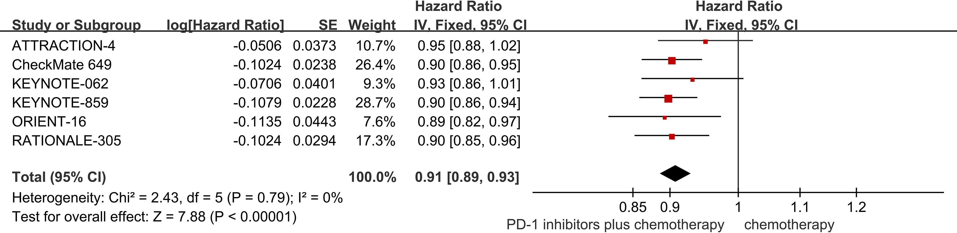 Six studies provided data regarding OS (1823). The pooled result showed that PD-1 inhibitors plus chemotherapy significantly improved OS compared with chemotherapy (HR = 0.91; 95% CI 0.89 to 0.93; P<0.01) (Figure 3).