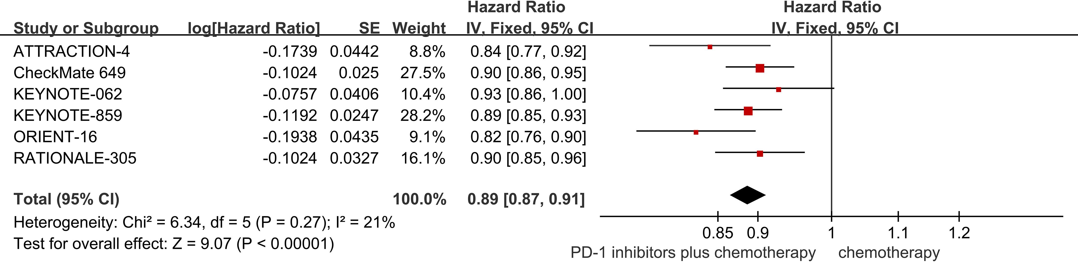 Forest plot showing hazard ratios for six studies evaluating PD-1 inhibitors plus chemotherapy, including ATTRACTION-4, CheckMate 649, KEYNOTE-062, KEYNOTE-859, ORIENT-16, and RATIONALE-305. The pooled hazard ratio is 0.89 with a 95% confidence interval of 0.87 to 0.91, indicating reduced risk. Each study includes log hazard ratio, standard error, and weight. Statistical measures indicate low heterogeneity (Chi² = 6.34, I² = 21%). The plot visually represents each study's effect size and confidence interval with red squares and lines, and the overall effect is marked by a diamond.