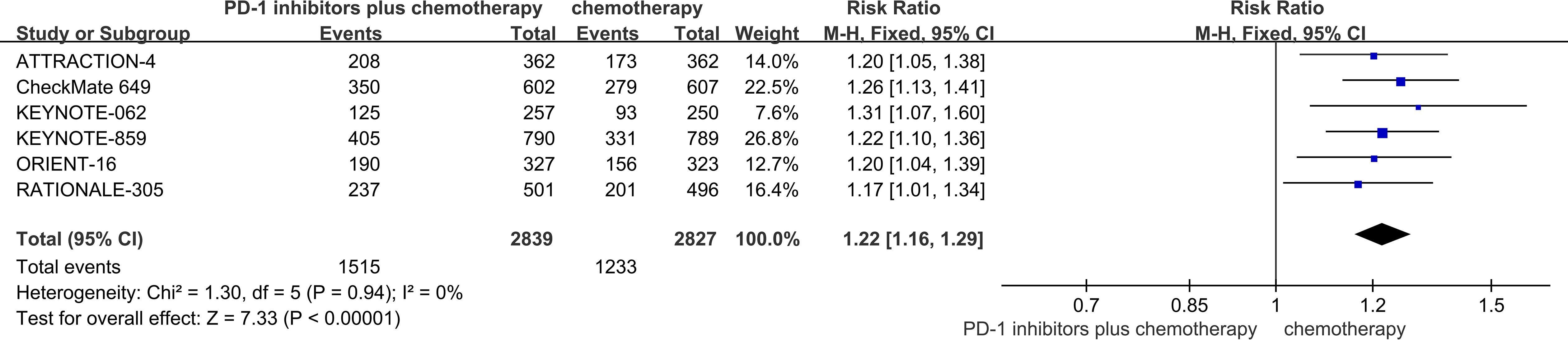 Forest plot showing risk ratios for PD-1 inhibitors plus chemotherapy versus chemotherapy alone across six studies: ATTRACTION-4, CheckMate 649, KEYNOTE-062, KEYNOTE-859, ORIENT-16, and RATIONALE-305. Each study shows a risk ratio with a 95% confidence interval. The overall effect shows a risk ratio of 1.22 with a 95% confidence interval of 1.16 to 1.29. Heterogeneity is low with Chi² = 1.30, df = 5, P = 0.94, and I² = 0%. The test for overall effect shows Z = 7.33, P < 0.00001.