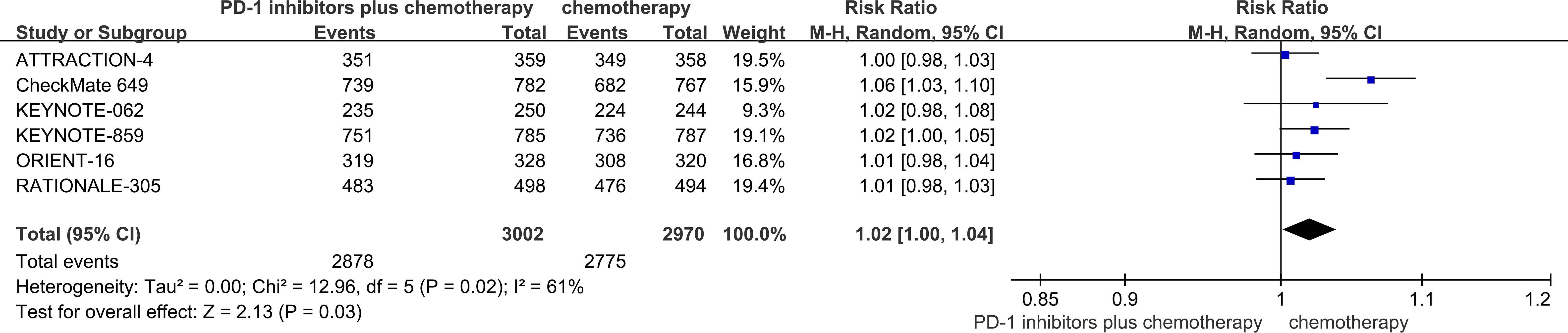 Forest plot comparing PD-1 inhibitors plus chemotherapy versus chemotherapy alone across six studies. Risk ratios with 95% confidence intervals are shown. The overall risk ratio is 1.02, suggesting a slight benefit for the combination therapy. Heterogeneity is moderate, with \(I^2\) at 61%.