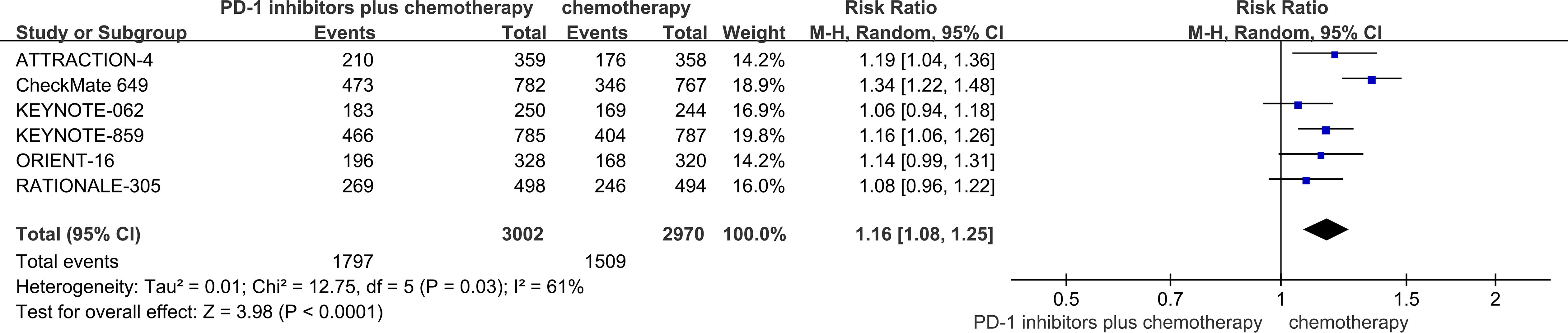 Forest plot comparing PD-1 inhibitors plus chemotherapy versus chemotherapy alone across six studies. Risk ratios with 95% confidence intervals indicate higher efficacy for the combination therapy. Total events: 1797 for combination, 1509 for chemotherapy alone. Overall risk ratio is 1.16 with confidence interval [1.08, 1.25], suggesting significant improvement. Heterogeneity is moderate with I² = 61%.