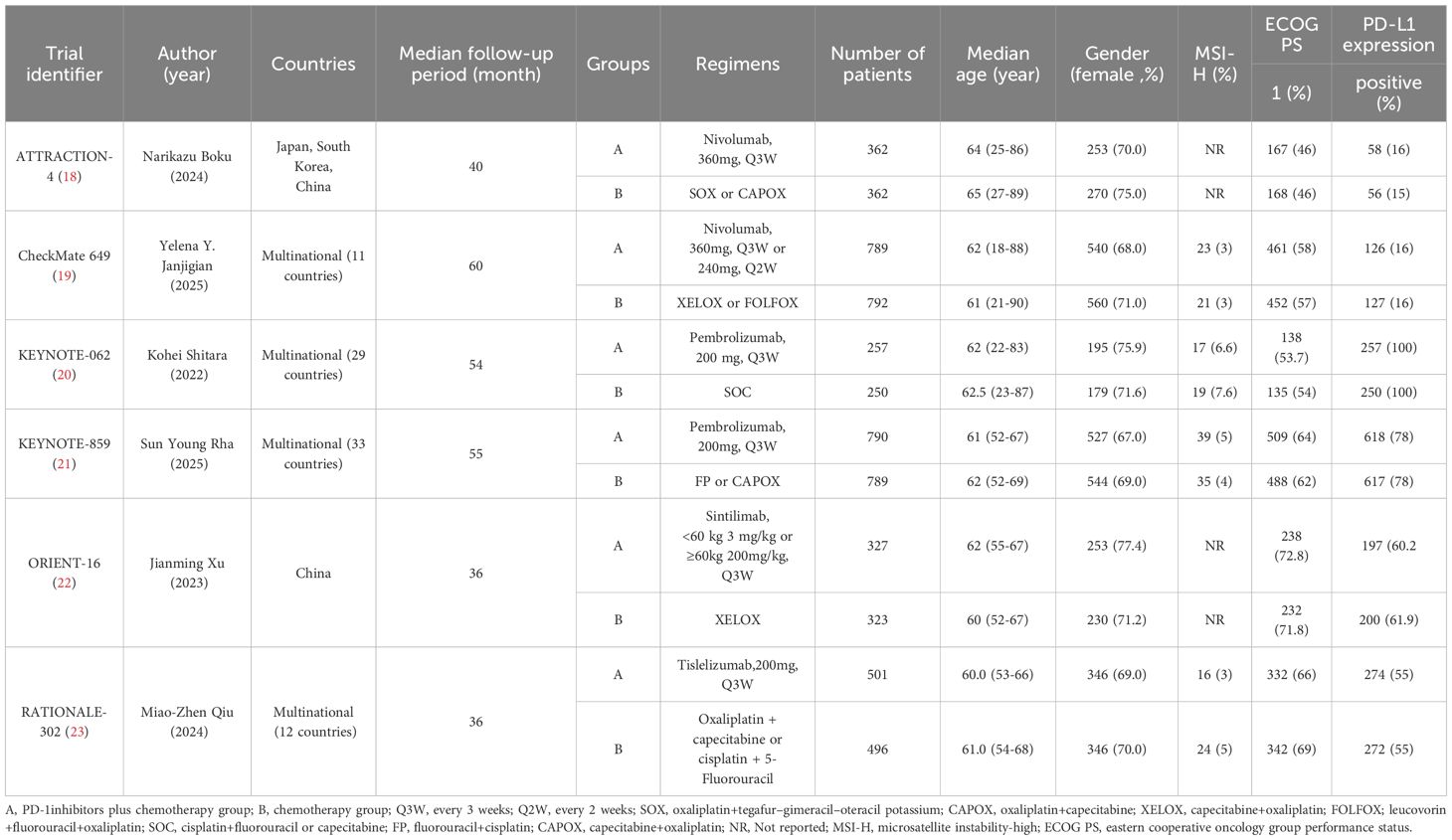 This meta-analysis included six RCTs (1823) published between 2020 and 2025. These trials enrolled a total of 6038 patients diagnosed with untreated advanced HER2-negative GC. Among these patients, 3026 patients were administered first-line PD-1 inhibitors plus chemotherapy, while 3012 patients received first-line chemotherapy alone. The Trial identifier, author(year), countries, groups, regimens, number of patients, median age, gender, MSI-H, ECOG PS, and PD-L1 expression were shown in Table 1.