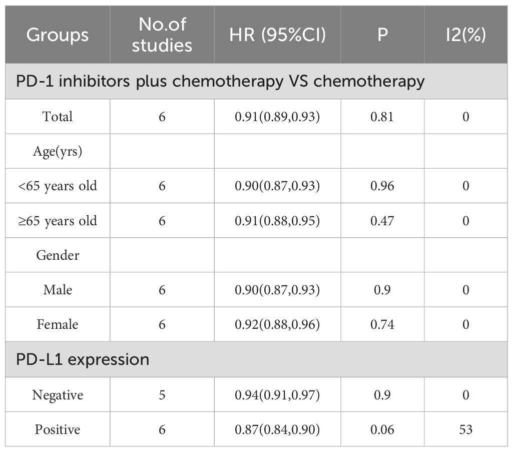Subgroup analyses were conducted regarding PD-L1 expression, age, and gender (Table 2). It was worth noting that, PD-1 inhibitors plus chemotherapy significantly improved OS compared with chemotherapy regardless of the PD-L1 expression, age, and gender of the patients.