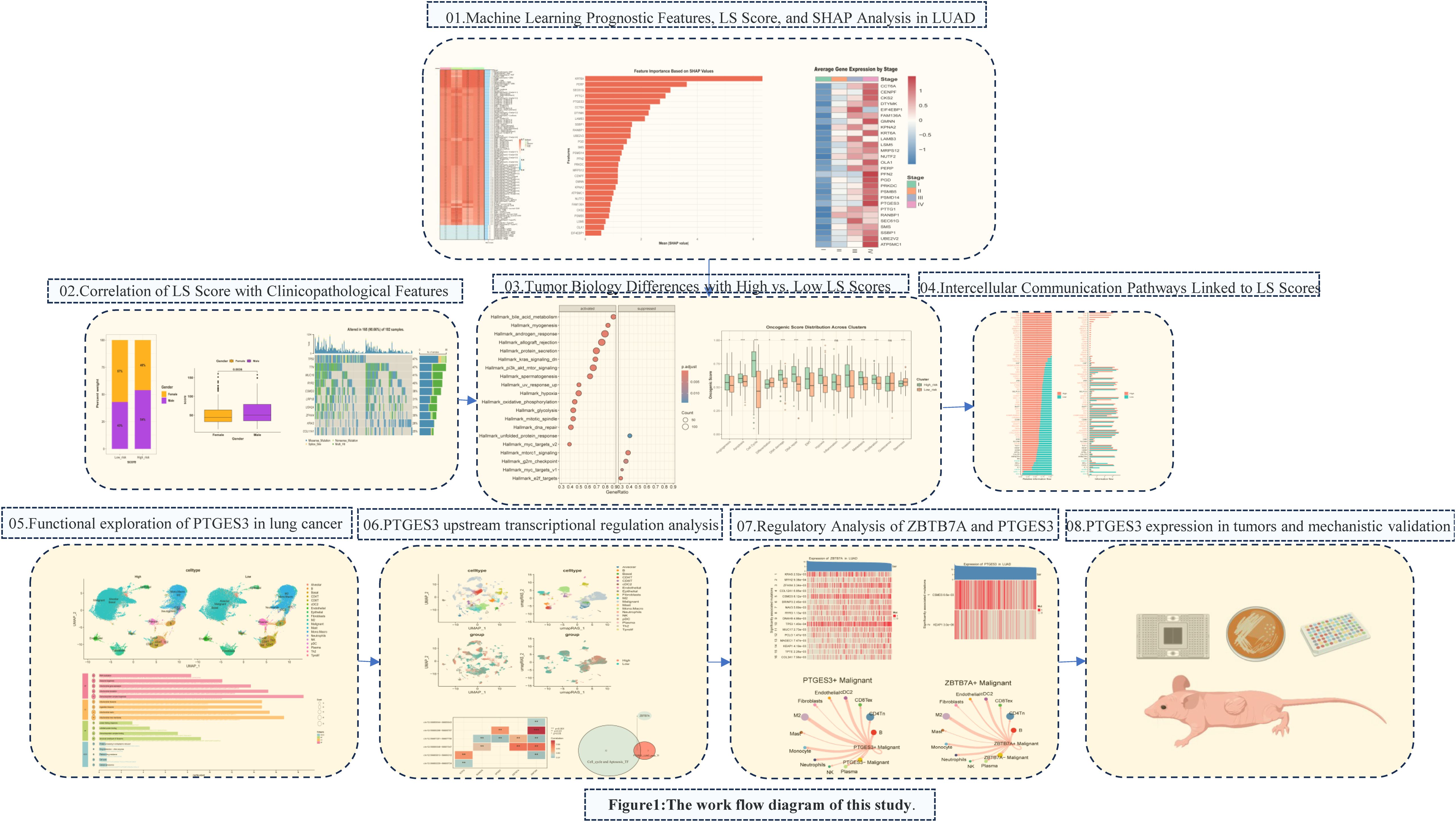 Materials and methods: RNA-seq data from TCGA and GEO were analyzed using Cox regression and 10 machine learning algorithms to identify prognostic genes and stratify patients. Single-cell datasets were integrated to examine PTGES3’s role in tumor progression, with SCENIC and ATAC-seq revealing its transcriptional regulators. PTGES3 expression was evaluated via tissue microarray immunohistochemistry. Functional assays (CCK-8, colony formation, flow cytometry, Western blot) after lentiviral knockdown in lung cancer cells assessed its effects on proliferation, apoptosis, and cell cycle. ZBTB7A was validated as a transcriptional regulator of PTGES3 by dual-luciferase reporter assay, and xenograft models in nude mice evaluated tumor growth in vivo.