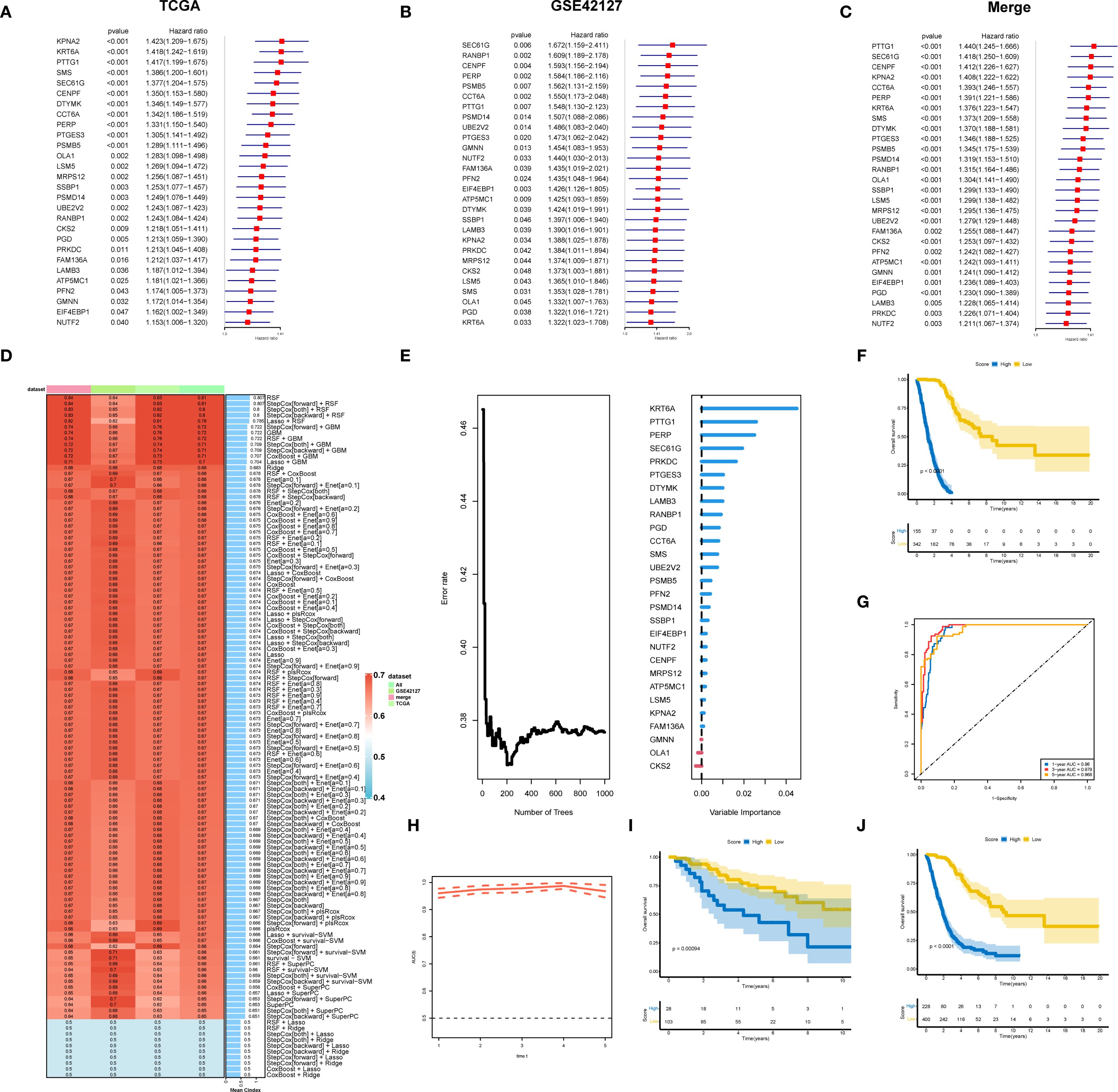 Figure 2. A prognostic gene signature for LUAD patients. (A) Results of univariate prognostic regression analysis of TCGA-LUAD. (B) Results of univariate prognostic regression analysis of GSE42127. (C) Univariate prognostic regression analysis results combining TCGA-LUAD and GSE42127. (D) TCGA data were used as the training set, with other datasets as validation sets. Ten machine learning algorithms and various combinations were employed to construct prognostic models, with the obtained C-indexes displayed. (E) Twenty-eight genes were modeled using RSF, highlighting their importance. (F) Survival analysis for the training dataset TCGA-LUAD. (G) Evaluation of the random forest model’s prognostic prediction capability in the training set using the ROC curve. (H) Time-dependent ROC curve. (I) Survival analysis of the GSE42127 validation set. (J) Survival analysis of the merged cohort validation set.
