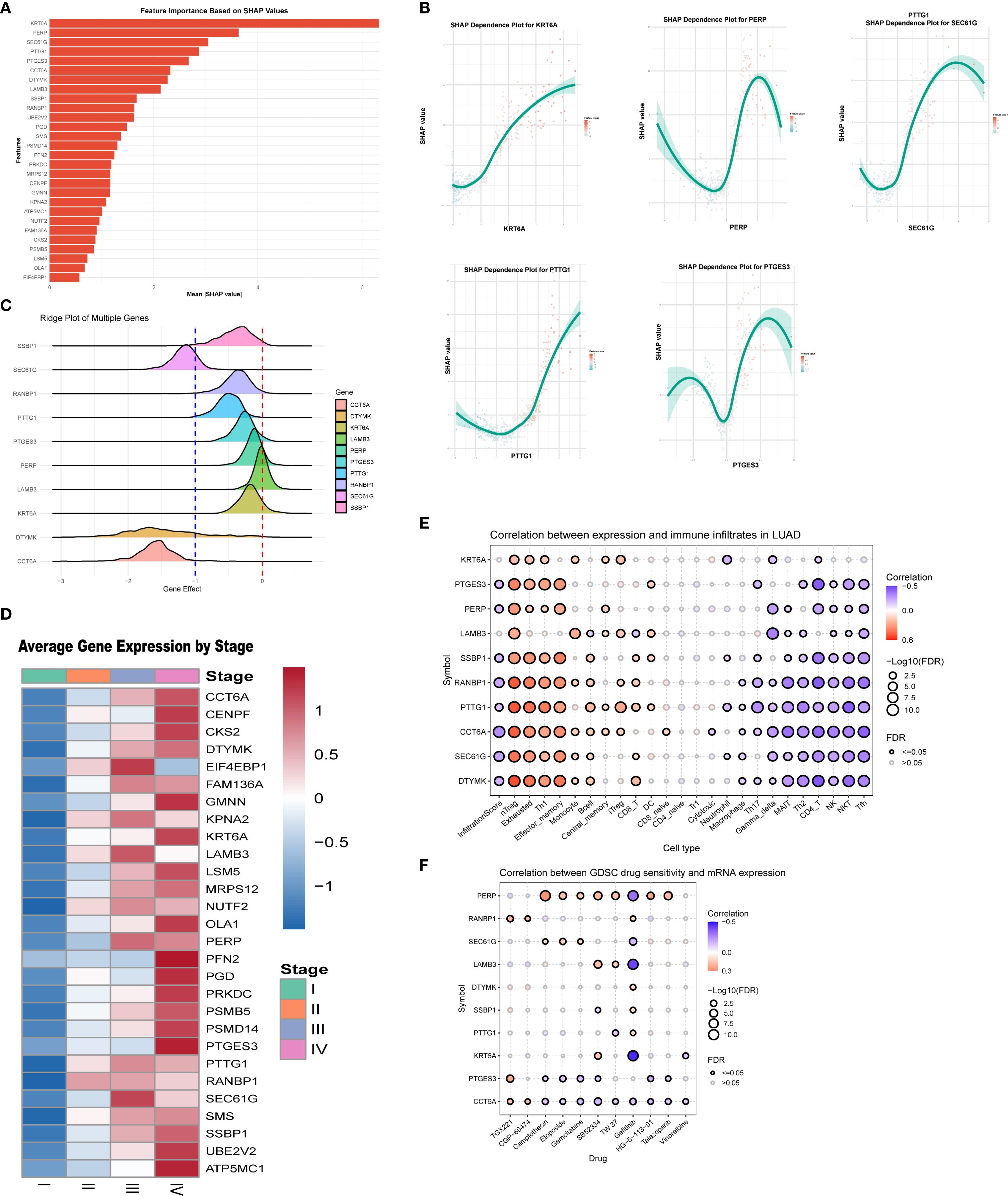 Figure 3. Key gene analysis of the LS model. (A) SHAP analysis of the RSF model revealed the distribution of SHAP values for the featured genes, highlighting the varying impacts of different genes on model predictions. (B) The SHAP dependence plot illustrates the relationship between feature values and SHAP values, identifying the top five genes that exert the greatest influence on predictions. (C) The Cancer Dependency Map (DepMap) analysis assessed the effects of gene knockdown on cell viability and functionality. (D) Results indicate that the expression of key genes increases with tumor progression. (E) We also analyzed the association between the top ten genes and immune cell infiltration in lung adenocarcinoma. (F) Finally, the relationship between gene expression levels and IC50 values of anticancer drugs was assessed, revealing a positive correlation that suggests high gene expression may contribute to resistance against these drugs.