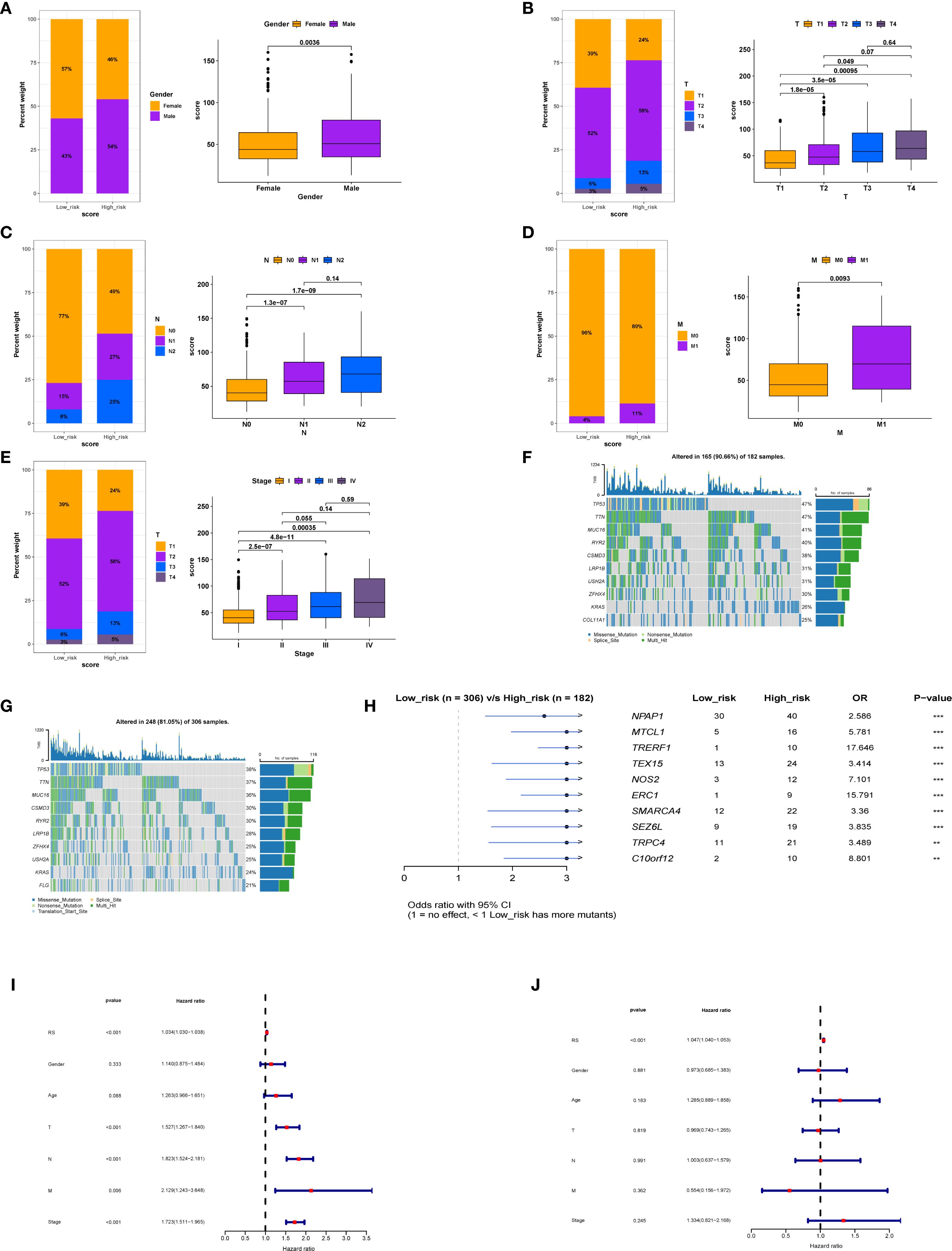 Figure 4. Relationship between model score and clinical factors in patients. (A) Association between model score and gender. (B) Correlation between model score and T stage. (C) Relationship between model score and N stage. (D) Relationship between model score and M stage. (E) Association between model score and overall stage. (F) Gene mutation status in the high-score group. (G) Differences in gene mutation profiles between the low-score group. (H) Comparative analysis of gene mutations between high and low-score groups. (I) Univariate analysis indicating that model score is an independent prognostic factor. (J) Multivariate regression analysis confirming that model score serves as an independent prognostic factor.