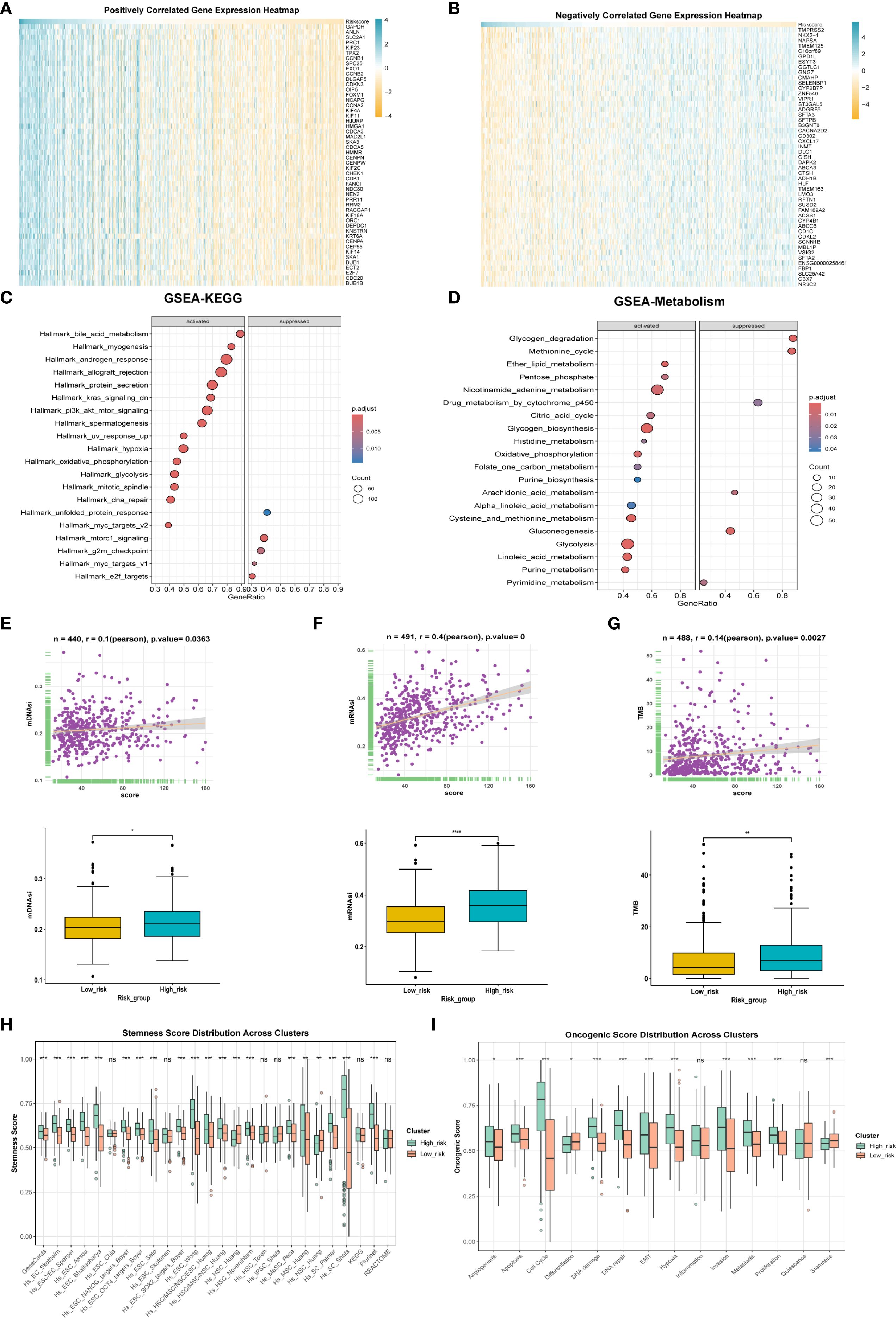 Figure 5. Differences in tumor biology between patients with high and low scores. (A) The correlation analysis between the model score and all genes, respectively, showed the positively correlated top50 genes using heat maps. (B) Expression levels of inversely correlated top 50 genes. (C) GESA enrichment analysis was employed to examine the differences in enriched pathways between high and low score groups. (D) GESA enrichment analysis was utilized to compare the metabolic enrichment differences between high and low score groups. (E) mDNAsi expression differences and correlation between high and low score groups. (F) Differences in mRNAsi expression and correlation between high and low score groups. (G) Differences in expression and correlation between scores in high and low score groups and tumor mutational burden. (H) Differences in stemness between high and low score groups. (I) to compare the differences of tumor phenotypic indicators between high and low score groups. * p < 0.05, ** p < 0.01, *** p < 0.001.