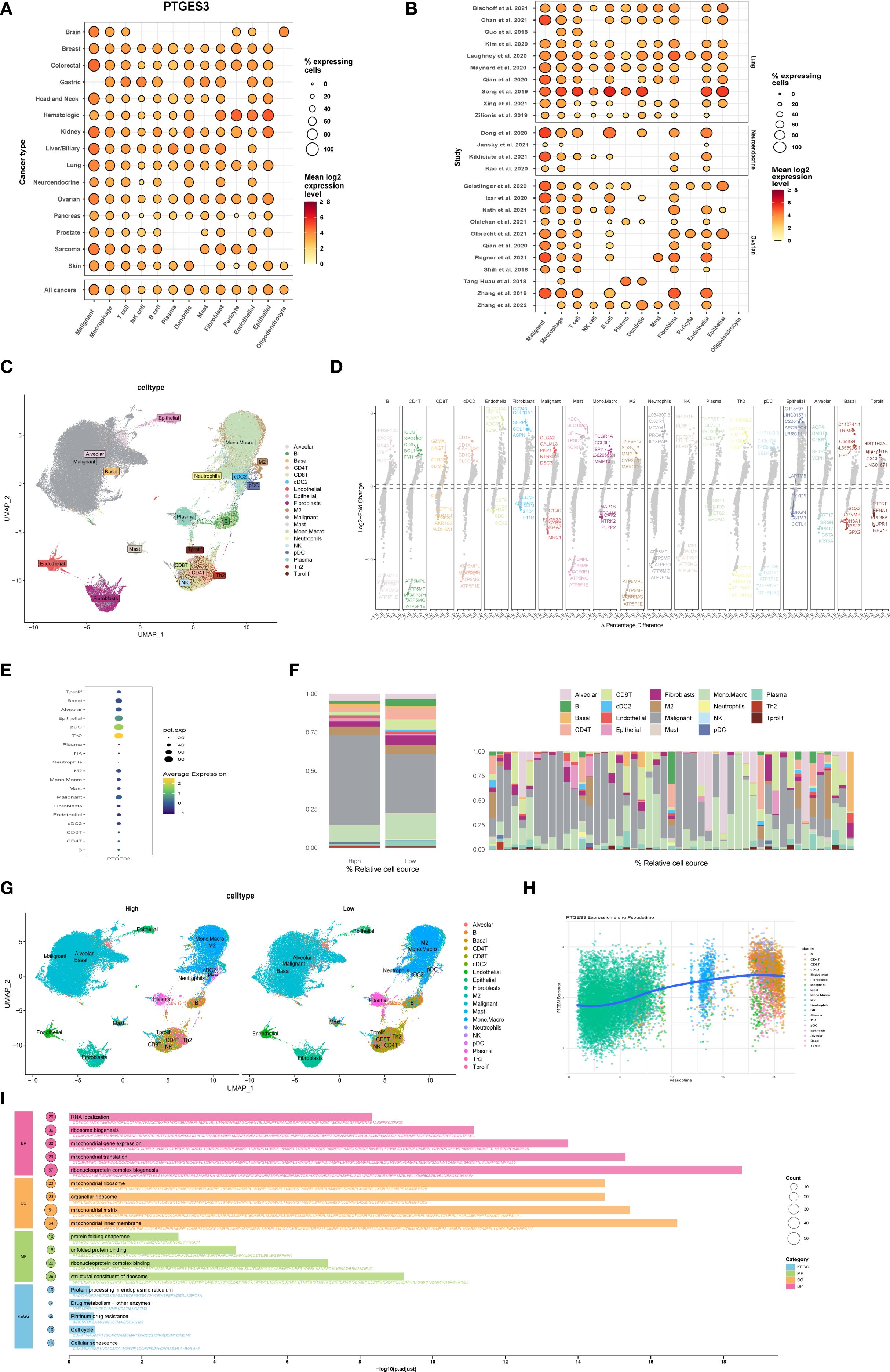 Figure 6. Functional exploration of PTGES3 in lung cancer. (A) Gene expression analysis across multiple tumor single-cell datasets, showing that PTGES3 is universally expressed in both tumor cells and the tumor microenvironment. (B) Gene expression profiles for each single-cell dataset. (C) Dimensionality reduction results of single-cell data, demonstrating cell clustering. (D) Identification of differentially expressed genes across various cell types using the FindAllMarkers function, highlighting the top five genes with high and low expression levels within each cell type. (E) Additional gene expression analysis in single-cell data. (F) Left panel shows high and low expression groups, while the right panel presents the proportion of each cell type for each patient. (G) UMAP visualizations of cell distribution in high and low expression groups. (H) Cell trajectory analysis conducted with the R package Slingshot, illustrating the relationship between gene expression and the proposed temporal sequence, indicating that more mature cells exhibit higher gene expression. (I) Enrichment analysis of differential genes between high and low expression groups based on single-cell data, performed using the R package clusterProfiler, with results presented separately for Biological Process (BP), Molecular Function (MF), Cellular Component (CC), and KEGG pathways.