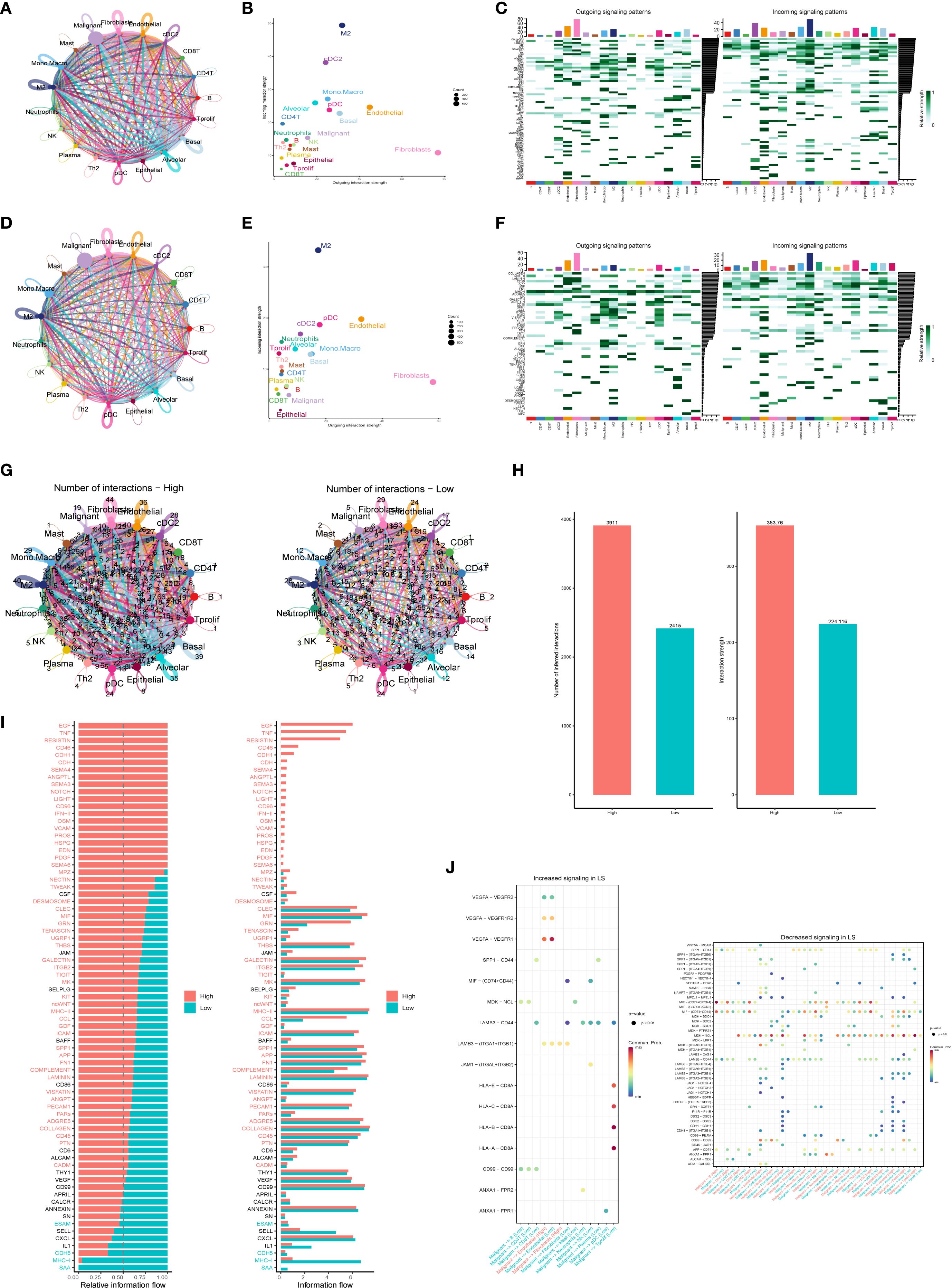 Figure 7. Intercellular communication analysis revealing specific pathways linked to high and low expression of PTGES3. (A) Circle diagram illustrating the number of interactions in the high expression group. (B) Scatter plots highlighting the distribution of efferent and afferent intensities in interactions (high and low), showing the strength of interactions between different cell types in the high expression group. (C) Heat maps displaying the output (left) and input (right) signal intensities of each signaling pathway in various cell types within the high expression group. (D) Number of interactions among cells in the low expression group. (E) Scatter plots depicting the distribution of efferent and afferent intensities in interactions (high and low), illustrating the strength of interactions between different cell types in the low expression group. (F) Heat maps showing the output (left) and input (right) signal intensities of each signaling pathway in different cell types within the low expression group. (G) Comparison of the number of interactions between different cell types in the high and low expression groups. (H) Bar graphs depicting the number and strength of interactions among various cell types. (I) Bar chart representing the two states of “High” (red) and “Low” (cyan) to visually display information flow related to different genes. (J) Bubble plots showcasing enhanced and attenuated ligand-receptor pairs in the low-score group.
