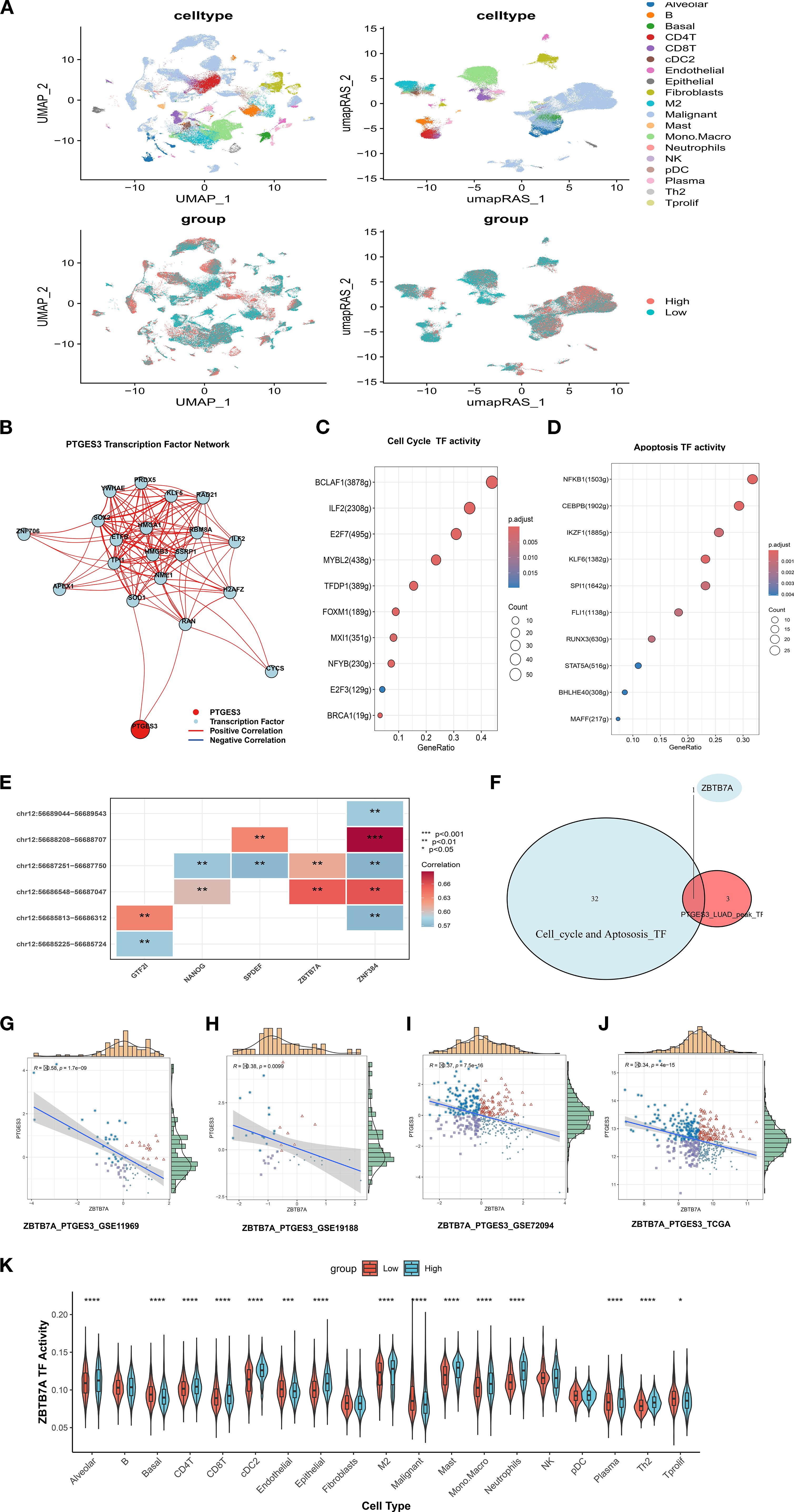 Figure 8. PTGES3 upstream transcriptional regulation analysis. (A) Expression of RAS-based single-cell UMAPs according to PTGES. (B) Prediction of transcription factors upstream of PTGES3 using pySCENIC data. (C) Transcription factors involved in regulating the cell cycle. (D) Transcription factors implicated in apoptosis regulation. (E) Heatmap showing the correlation between various transcription factors and ATAC peaks. (F) Venn diagram illustrating the intersection of transcription factors that regulate PTGES3 cell cycle and apoptosis, as predicted by Chip analysis. (G) Scatter plot of correlation between ZBTB7A and PTGES3 in GSE11969. (H) Scatter plot of correlation between GSE19188 ZBTB7A and PTGES3. (I) Scatter plot of correlation between ZBTB7A and PTGES3 in GSE72094. (J) Scatter diagram of correlation between ZBTB7A and PTGES3 in TCGA. (K) Activity of the ZBTB7A transcription factor varies between PTGES3 high and low expression groups within different cell subsets at the single-cell level. * p < 0.05, ** p < 0.01, *** p < 0.001, **** p < 0.0001.