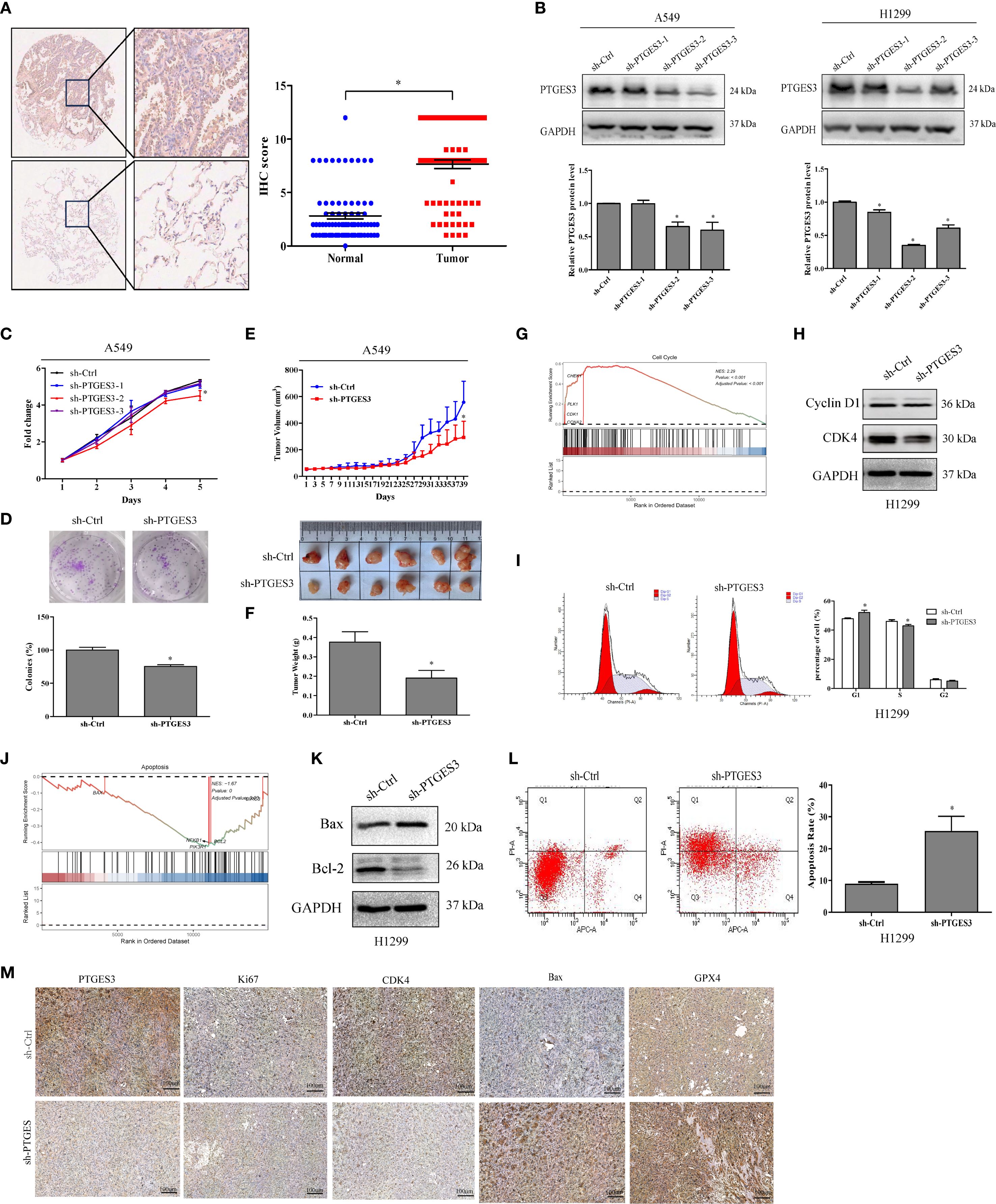 Figure 9. PTGES3 expression in tumors and mechanistic validation. (A) PTGES3 protein expression was assessed in lung cancer tissues and non-cancerous colorectal tissues via IHC. (B) Knockdown of PTGES3 in H1299 and A549 cells using three sh-PTGES3 sequences was verified by Western blot. (C) The effect of PTGES3 knockdown on lung cancer cell growth was evaluated with a CCK-8 assay, normalizing to Day 1 viability. (D) Colony formation analysis demonstrated reduced survival in cells with PTGES3 knockdown. (E, F) In vivo effects of PTGES3 knockdown on tumor growth were studied in a xenograft nude mouse model. (G) The tumor subset enrichment analysis using single-cell sequencing data indicated a GSEA enrichment analysis for samples with high PTGES3 expression. (H) Protein levels of Cyclin D1 and CDK4 were assessed in H1299 cells. (I) Flow cytometry analysis revealed cell cycle changes in H1299 cells following PTGES3 knockdown. (J) enrichment analysis of tumor subsets from single-cell sequencing data also suggested GSEA enrichment for samples with elevated PTGES3 expression. (K) The protein levels of Bax and Bcl-2 were evaluated through Western blot analysis. (L) Flow cytometry analysis demonstrated alterations in apoptosis in H1299 cells with PTGES3 knockdown. (M) The histochemical differences among various tumor groups for each index were illustrated. Statistical significance was indicated as P<0.05 for all relevant comparisons. * p < 0.05.