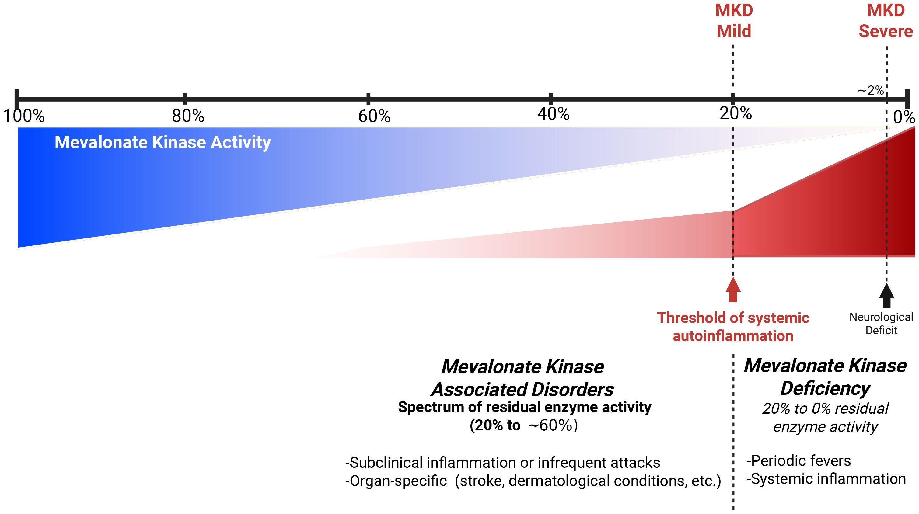 Autoimmune diseases are defined by adaptive immune system dysfunction, with lymphocytes attacking self-antigens. In contrast, autoinflammatory diseases arise from antigen-independent hyperactivation of innate immunity. Mevalonate kinase deficiency (MKD) is a monogenic, autosomal recessive, autoinflammatory disease resulting from biallelic pathogenic variants in the mevalonate kinase (MVK) gene. The downstream effects include defective protein prenylation, inflammasome activation, and hypersecretion of pro-inflammatory cytokines such as interleukin-1 (IL-1) (1). MKD encompasses a spectrum of phenotypes partially correlated with the MVK variants and residual enzymatic activity (2). Severely affected patients typically retain undetectable to 0.5% mevalonate kinase activity, often presenting with constitutive mevalonic aciduria, prominent neurological and ophthalmic involvement, and chronic systemic inflammation (3). Classically, milder forms preserve 1% to 20%–28% enzymatic activity (4) and exhibit recurrent febrile episodes with aphtosis, abdominal pain, diarrhea, arthromyalgia, painful lymphadenopathies, maculopapular rash, and other manifestations (3, 5). Attacks last for 3–7 days and are often triggered by fatigue, physical exertion, infections, or vaccination. In mild MKD, urinary mevalonic acid is usually detectable only during attacks. Atypical MKD phenotypes are increasingly reported, and the spectrum of MKD phenotypes continues to expand within the medical literature (3). We recently reported the first case of MKD-related inflammation causing ischemic stroke (IS) (6).