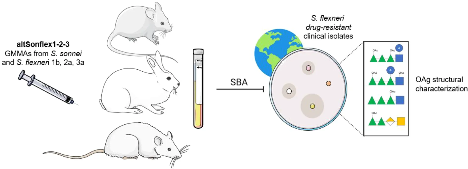 For all strains tested, except the S. flexneri 6 strain, titers of preclinical sera were similar to those elicited from human sera. In conclusion, our results suggest that altSonflex1-2–3 could offer protection against a panel of homologous and heterologous antimicrobial-resistant Shigella strains, with a strong potential impact on global health. altSonflex1-2–3 is being tested in Phase 2 clinical trials (NCT06663436 and NCT05073003), and the functionality of sera from vaccinated infants will be tested against the panel of drug-resistant clinical isolates as well to confirm preclinical data. Testing in the Phase 3 clinical trial will confirm the ability of the vaccine to protect in the field.