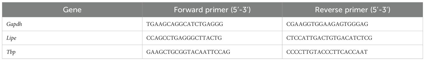 White adipose tissue was isolated, snap-frozen and stored at -20°C. The Aurum Total RNA mini Kit (Bio-Rad) was used for total RNA isolation following the manufacturer’s instructions. RNA concentration and quality were measured using the Nanodrop 1000 (Thermo Scientific) and 1000 ng RNA was used for cDNA synthesis with the Sensifast cDNA Synthesis Kit (Bioline). cDNA was 10 time diluted in nuclease-free water. RT-qPCR was executed using the Bioline SensiFAST SYBR No-ROX mix (Bioline) and the Roche LightCycler 480 system (Applied Biosystems). Genorm was used to determine the stability of the housekeeping genes and qPCR data were analyzed with qBase+ software (Biogazelle). Results are depicted as relative expression values normalized to the geometric mean of the housekeeping genes. Used qPCR primers are depicted in Table 1.