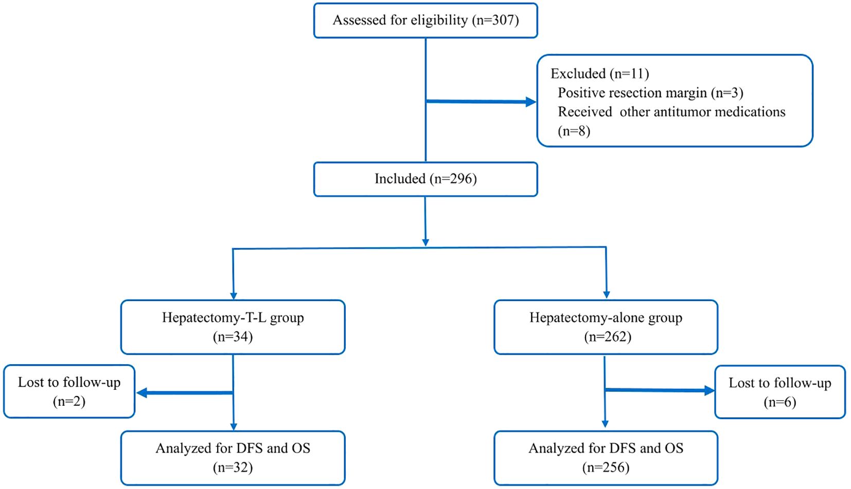 Results: A total of 288 patients were enrolled and assigned to the Hepatectomy alone group (n=256) and the Hepatectomy−T-L group (n=32) between January 2019 and December 2023. Baseline demographic and clinical characteristics were well balanced between the two groups. The median follow−up time was 28.73 months (95% CI 26.03–31.43 months). The median DFS was significantly longer in the Hepatectomy-T-L group than in the Hepatectomy Alone group [40.78 months (95% CI 29.25–52.31) vs. 28.80 months (95% CI 25.52–32.08), hazard ratio [HR] = 0.51 (95% CI 0.28–0.91), P = 0.021]. The median OS was also significantly longer in the Hepatectomy-T-L group than in the Hepatectomy Alone group [42.10 months (95% CI 37.55–46.65) vs. 34.00 months (95% CI 30.40–37.60), HR = 0.36 (95% CI 0.18–0.70), P = 0.0018]. Adverse events were more frequently observed in the Hepatectomy-T-L group. The incidence of adverse events (AEs) was compared and manageable between the two groups.