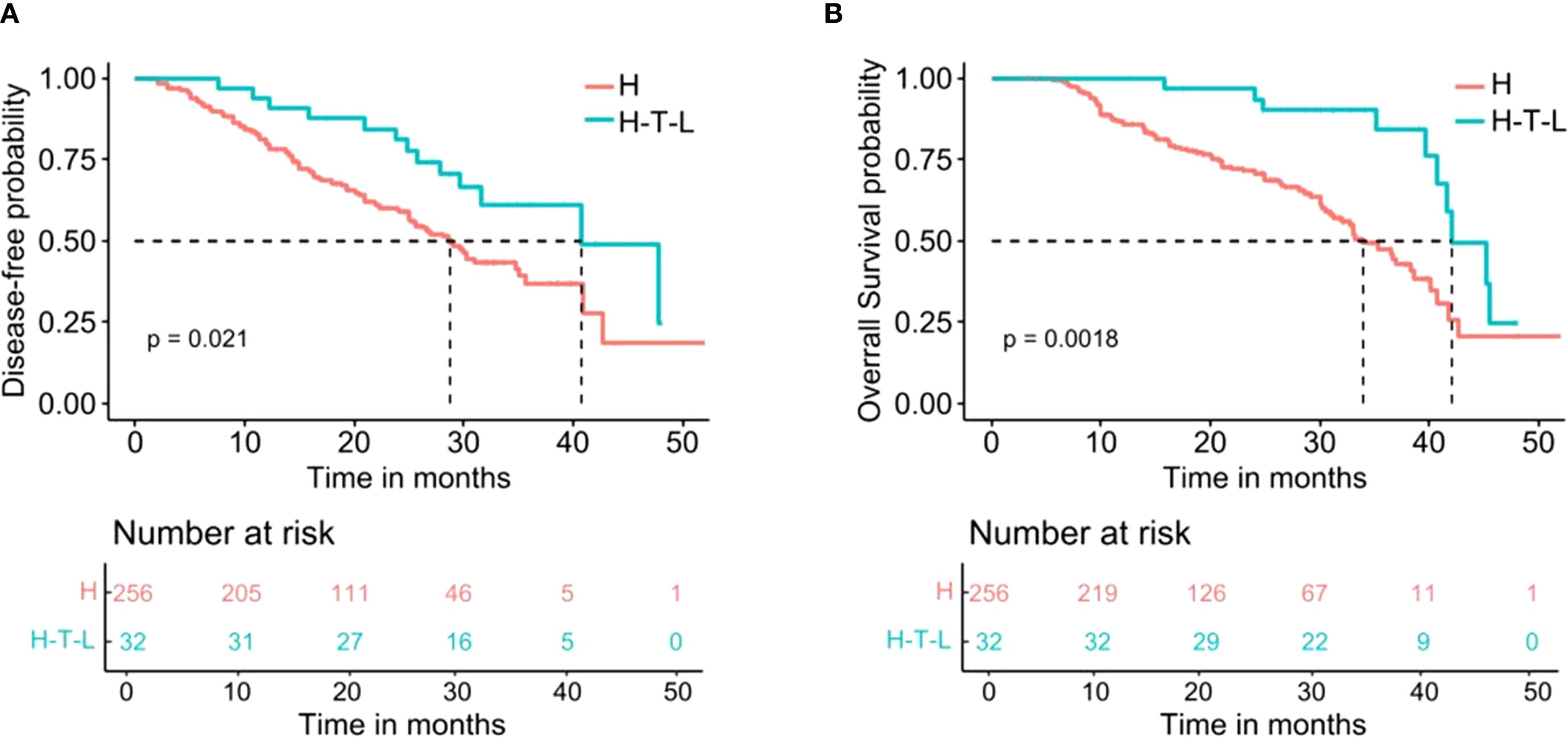 Figure 2. Kaplan-Meier analysis for survival in patients with HCC after hepatectomy stratified by adjuvant tislelizumab and lenvatinib. (A) Disease-free survival. (B) Overall survival. H indicates the Hepatectomy alone group; H-T-L means the Hepatectomy-T-L group.