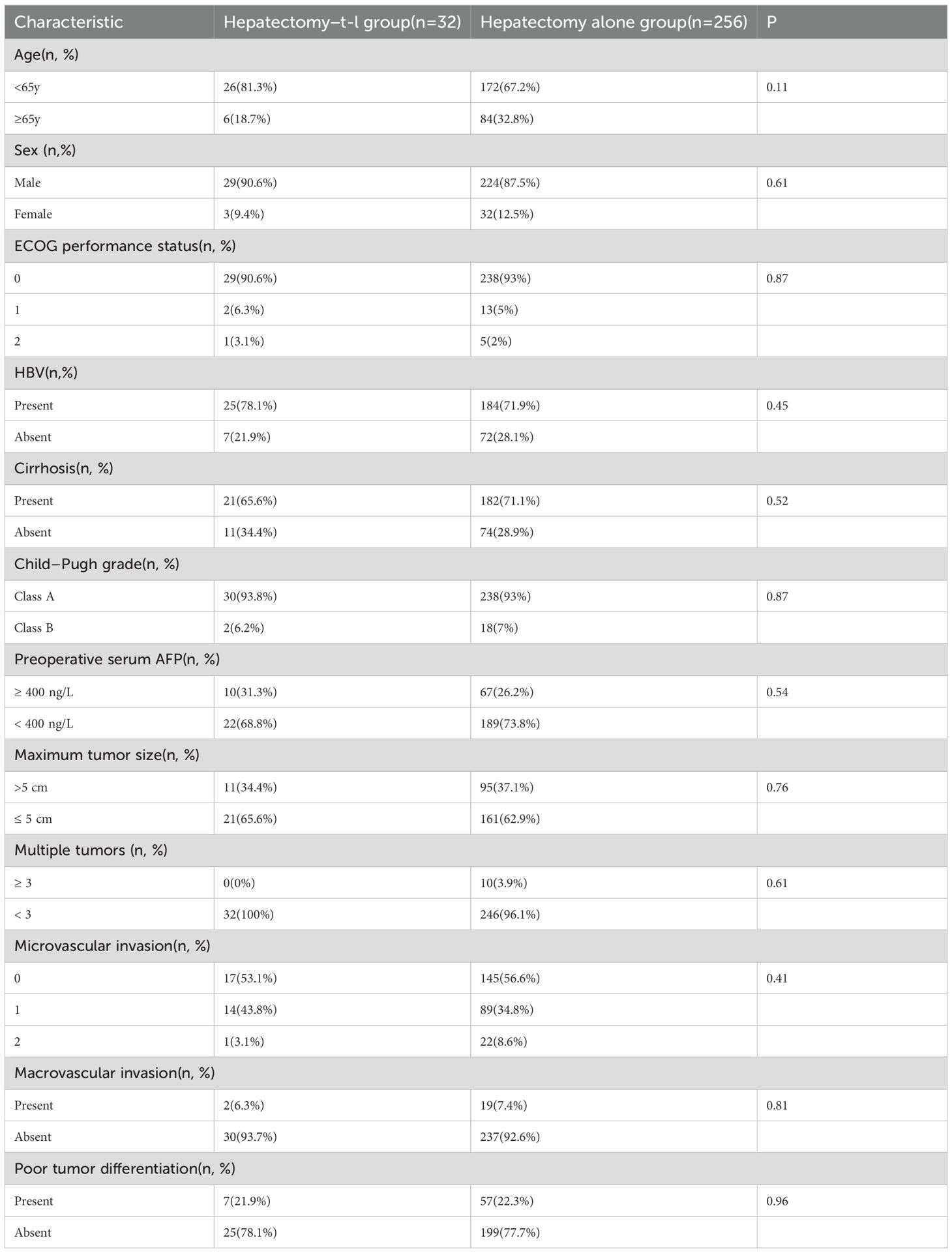 A total of 296 patients were included in the study and subsequently categorized into two groups: those receiving adjuvant therapy with Tislelizumab and Lenvatinib following curative hepatectomy (the Hepatectomy-T-L group, n = 34) and those undergoing hepatectomy alone (the Hepatectomy-alone group, n = 262). In the Hepatectomy-T-L group, 2 patients were lost to follow-up, resulting in their exclusion from the analysis. Similarly, in the Hepatectomy alone group, 6 patients were lost to follow-up and were excluded from the final analysis. Consequently, a total of 288 patients were included in the final analysis: 32 in the Hepatectomy-T-L group and 256 in the Hepatectomy-alone group (Figure 1). Baseline demographic and clinical characteristics were well balanced between the two groups (Table 1).