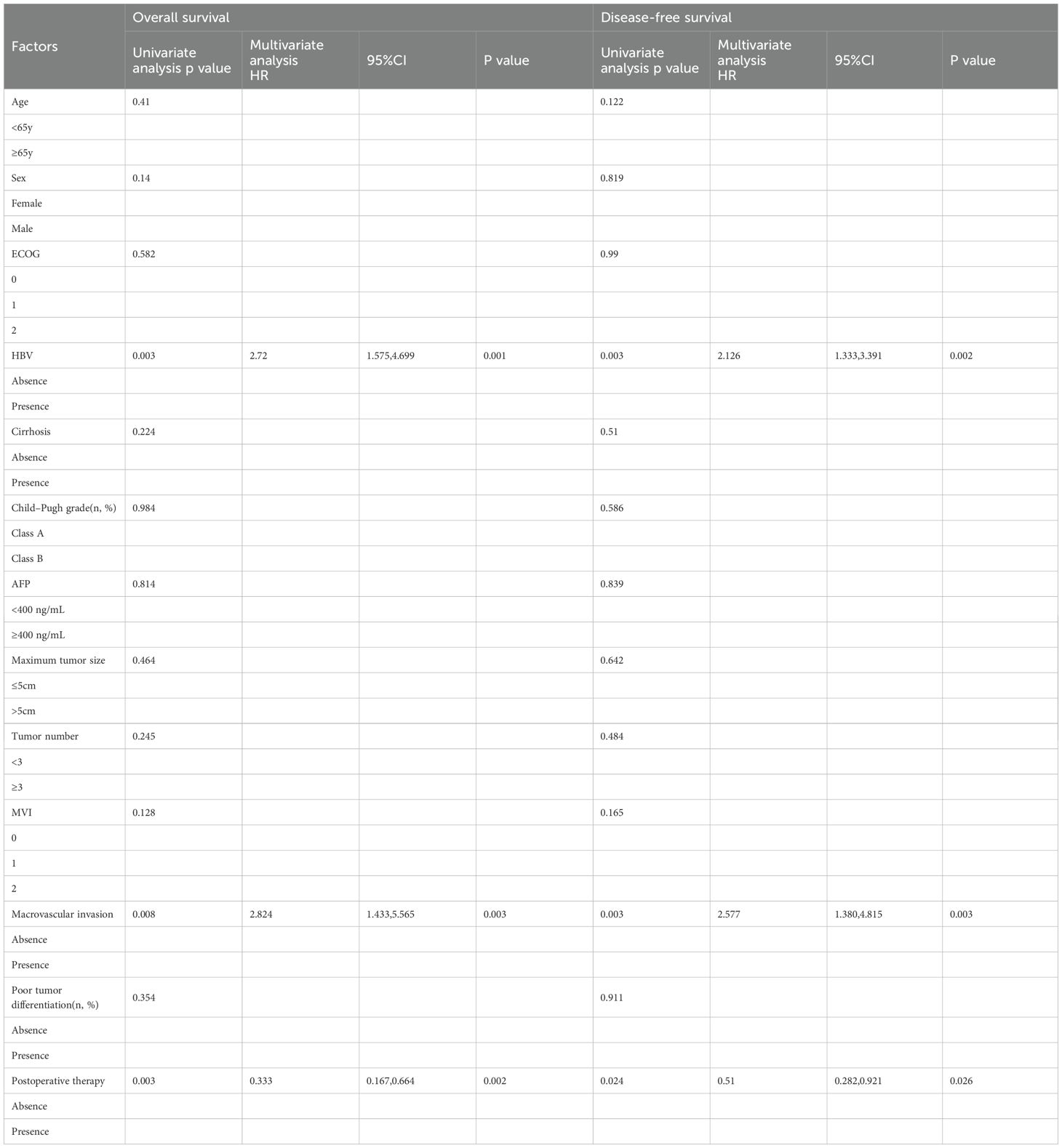Univariable and multivariable cox regression analysis were performed to assess the association between various clinical and pathological factors with OS and DFS. In the univariable analysis, we identified that HBV infection, macrovascular invasion, and postoperative adjuvant therapy were significantly associated with both OS and DFS. Multivariable analysis further revealed that HBV infection (HR: 2.72, 95% CI 1.575–4.699, P = 0.001), macrovascular invasion (HR: 2.824, 95% CI 1.433–5.565, P = 0.003), and postoperative therapy (HR: 0.333, 95% CI 0.167–0.664, P = 0.024) were independent risk factors for OS. Similarly, HBV infection (HR: 2.126, 95% CI 1.333–3.391, P = 0.002), macrovascular invasion (HR: 2.577, 95% CI 1.380–4.815, P = 0.003), and postoperative therapy (HR: 0.51, 95% CI 0.282–0.921, P = 0.026) were found to be significantly associated with DFS (Table 2).