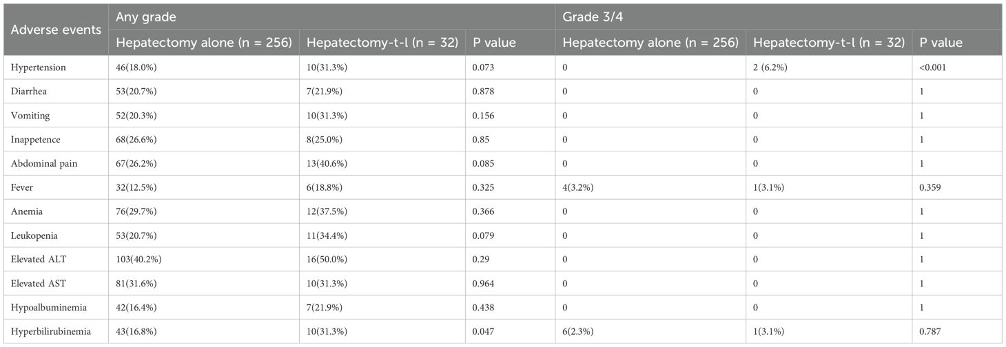 The incidence of adverse events (AEs) was compared between the Hepatectomy-Alone and Hepatectomy-T-L groups (Table 3). Common AEs included abdominal pain (40.6% vs. 26.2%), elevated ALT (50.0% vs. 40.2%), and anemia (37.5% vs. 29.7%), with no significant differences between the groups (p > 0.05). Notably, hyperbilirubinemia was more frequent in the Hepatectomy-T-L group (31.3% vs. 16.8%, p = 0.047). There were also higher rates of hypertension (31.3% vs. 18.0%, p = 0.073) and leukopenia (34.4% vs. 20.7%, p = 0.079) in the Hepatectomy-T-L group, although these differences did not reach statistical significance. For grade 3/4 AEs, hypertension was significantly more prevalent in the Hepatectomy-T-L group, with 2 cases (6.2%) compared to none in the Hepatectomy-Alone group (p < 0.001). Fever (3.1% vs. 3.2%) and hyperbilirubinemia (3.1% vs. 2.3%) were similarly distributed between the two groups (p > 0.05).