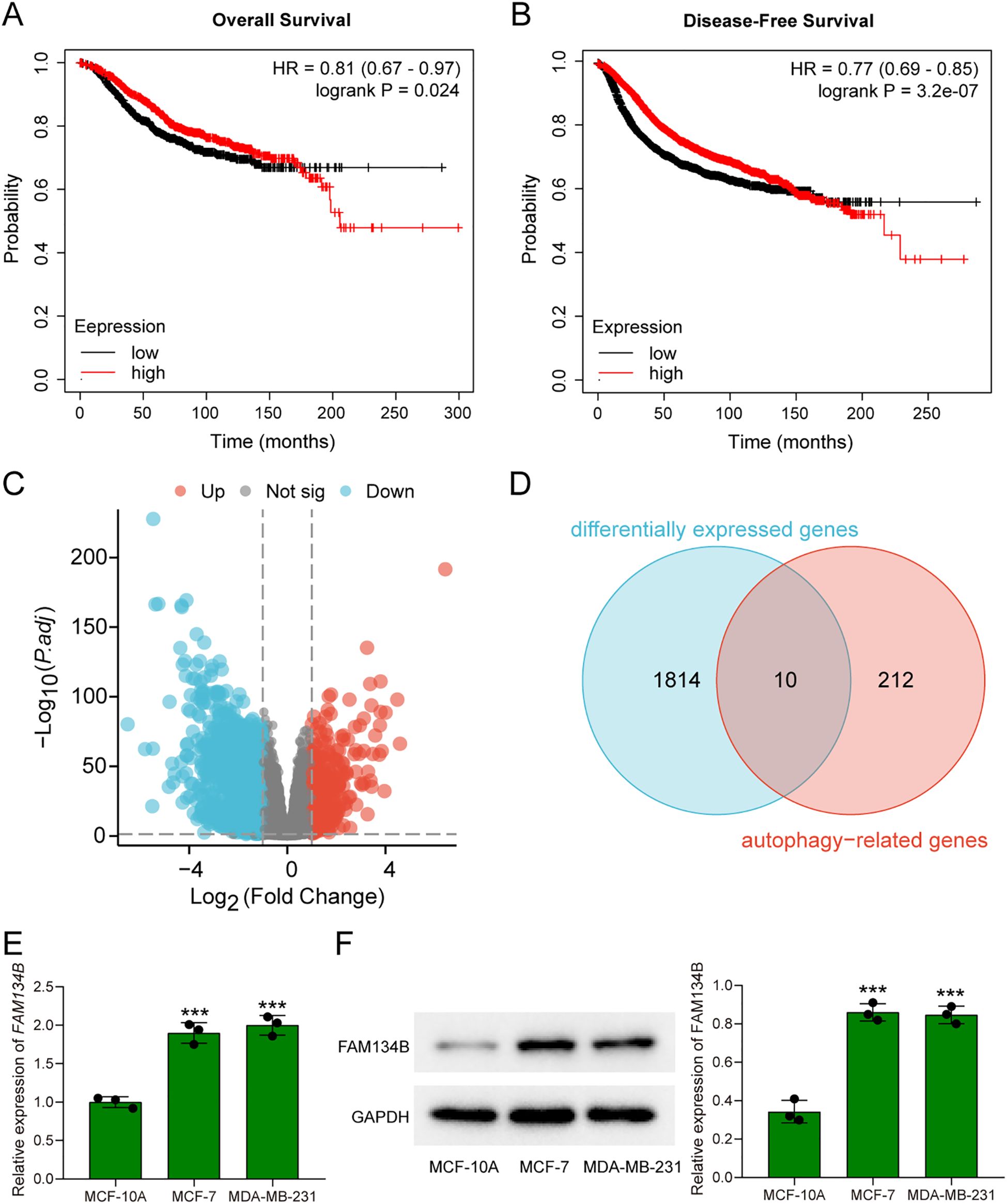 Figure 1. FAM134B was highly expressed in breast cancer. (A) The overall survival rates of breast cancer patients with high and low expression of FAM134B. (B) The disease-free survival rates of breast cancer patients with high and low expression of FAM134B. (C) Volcano plot of differential expressed genes. (D) Venn diagram of differential expressed genes and autophagy-related genes. (E) The expression of FAM134B mRNA was detected by qRT-PCR. (F) Western blot was used to evaluate the expression of FAM134B in cells. ***P<0.001 compared with MCF-10A cells.