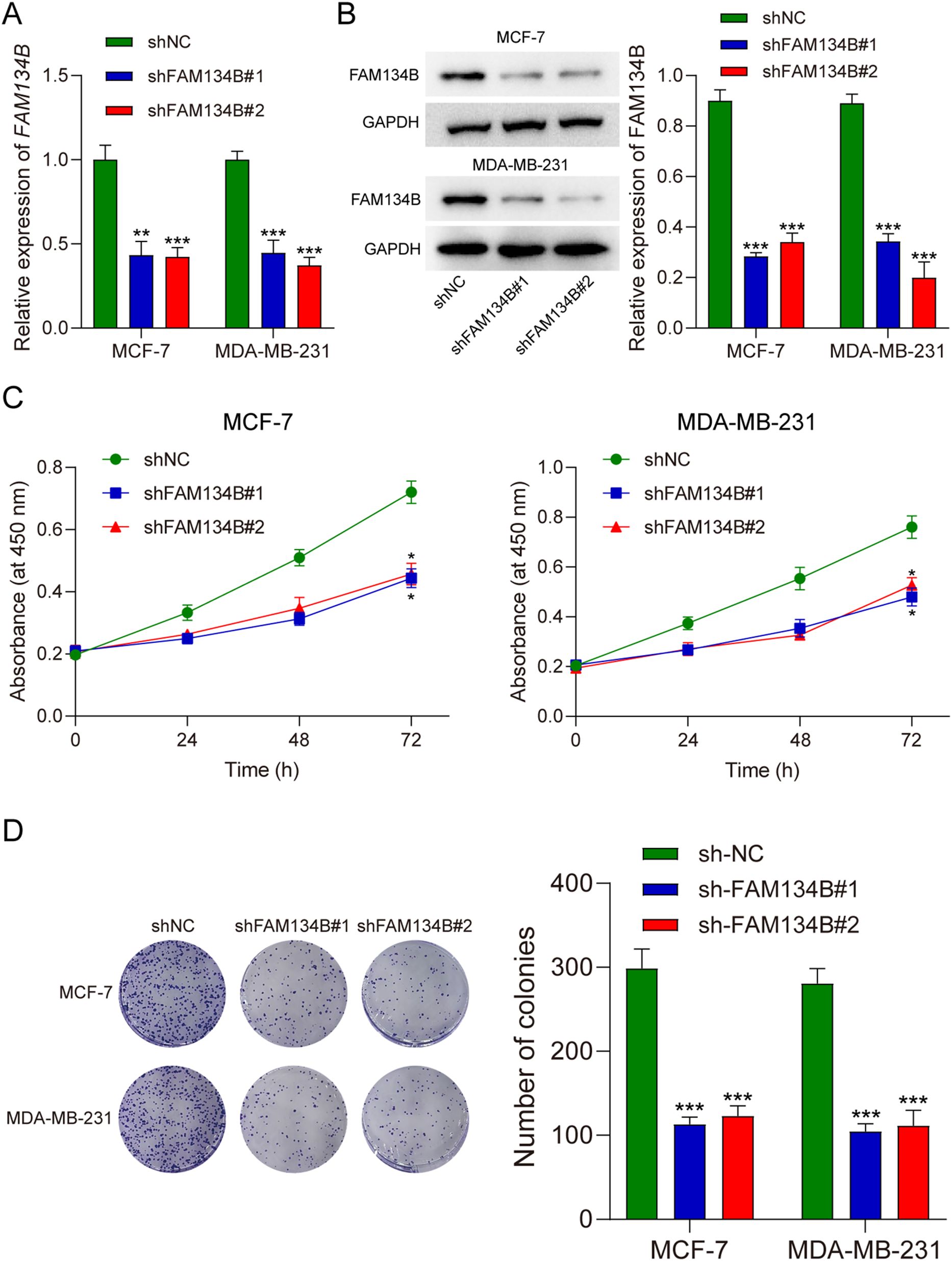 Figure 2. FAM134B knockdown suppressed proliferation of breast cancer cells. (A) The level of FAM134B mRNA was accessed by qRT-PCR after transfection. (B) The expression of FAM134B protein was detected using western blot after transfection. (C) CCK-8 assay was performed to calculate cell viability. (D) The proliferation ability of breast cancer cells was tested through clone formation assay. *P<0.05, **P<0.01, ***P<0.001 compared with shNC group.